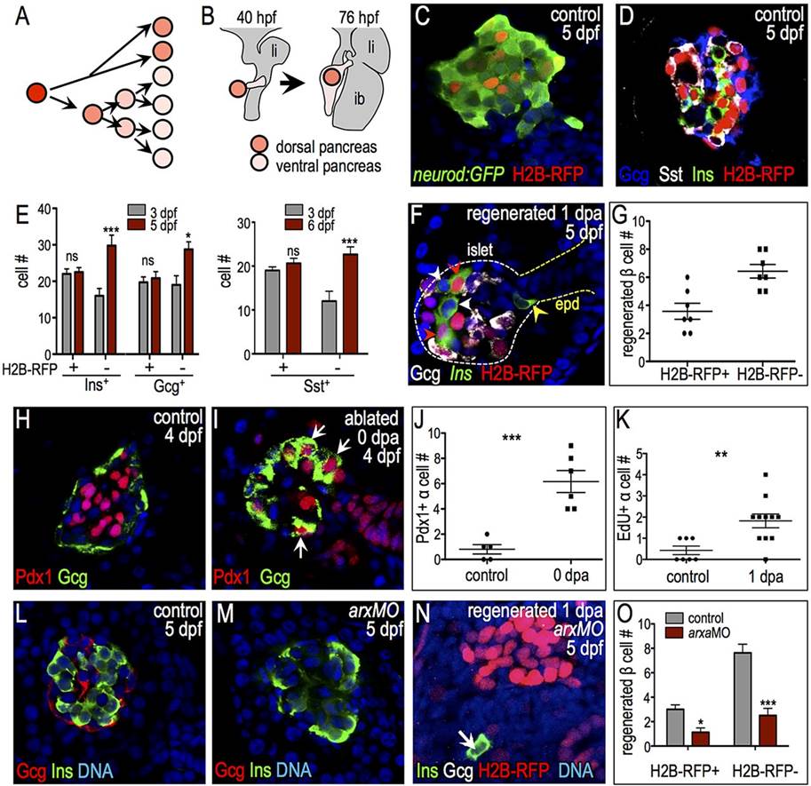 α-to-β cell transdifferentiation can be marked by the label-retaining cell (LRC) assay in the zebrafish principal islet. (A,B) Schematic of the LRC assay. (A) Zygotes were injected with H2B-RFP mRNA. Fluorescent signal from H2B-RFP protein was diluted by mitosis. (B) The LRC assay marks quiescent, early differentiated pancreatic endocrine cells derived from the dorsal bud. li, liver; ib, intestinal bulb. (C,D) Confocal planes of H2B-RFP-labeled 5-dpf islets. (C) TgBAC(neurod1:EGFP) (n=4). (D) Wild-type islet stained for insulin (green), glucagon (blue) and somatostatin (white) (n=5). (E) Quantification of H2B-RFP+ and H2B-RFP cells expressing insulin, glucagon and somatostatin (ne3 for all). (F) H2B-RFP-labeled regenerating islet of 5-dpf/1-dpa Tg(ins:CFP-NTR) larva stained for CFP (insulin, green) and glucagon (white). Red arrowheads indicate H2B-RFP+ regenerating β cells, white arrowheads indicate H2B-RFP regenerating β cells in the islet, and yellow arrowhead indicates H2B-RFP β cells in the extra-pancreatic duct region (epd). (G) Quantification of 1-dpa H2B-RFP+ and H2B-RFP β cells (n=7). (H,I) Confocal planes showing Pdx1 (red) and glucagon (green) expression in 4-dpf non-ablated (H) and ablated (I) islets. Pdx1+ α cells are indicated by arrows. (J) Quantification of α cells expressing Pdx1 in 4-dpf non-ablated (n=5) and ablated (n=6) islets. (K) Quantification of proliferating (EdU+) α cells in 5-dpf non-ablated and 1-dpa islets (ne7 islets examined). (L,M) Confocal planes showing glucagon (red) and insulin (green) staining in control MO-injected (L) and arxaMO-injected (M) 5-dpf larvae. Glucagon+ cells are absent from arxa morphant islets. (N) Confocal projection of arxaMO-injected 5-dpf/1-dpa Tg(ins:CFP-NTR) islet labeled with H2B-RFP lacking most β cell regeneration. Arrow indicates regenerated β cell. (O) Quantification of 1-dpa β cells in control MO-injected (gray, n=16) and arxaMO-injected (red, n=19) islets. *Pd0.05, **Pd0.01, ***Pd0.001; ns, not significant (Student′s t-test in J,K; two-way ANOVA followed by Bonferroni post-test in E,O).