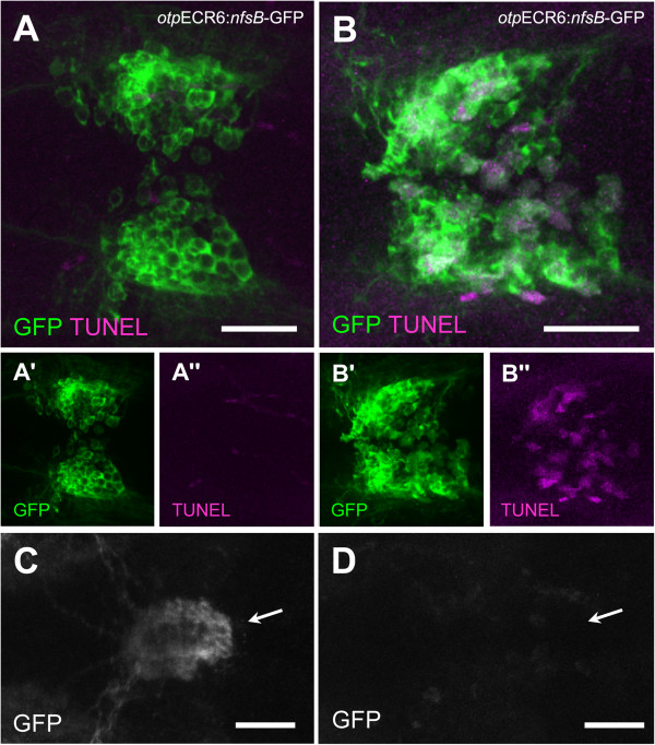 Nitroreductase-expressing cells inTg(otpECR6-E1b:nfsb-GFP)larvae display a reduction in the number of projections to the pituitary and an increase in apoptotic bodies when exposed to Mtz. A, TUNEL staining of the preoptic GFP expression domain in an untreated larva. B, TUNEL staining of the preoptic GFP expression domain in an Mtz-treated larva. C, Pituitary bundles of GFP-stained fibers in a control larva (arrow). D, The pituitary location in an Mtz-treated larva (arrow). Note that in the control larva, the GFP fibers reach the pituitary and no apoptosis is detected, but in the Mtz-treated larva, the pituitary innervation is disrupted and apoptosis is apparent in preoptic cell bodies. Scale bars: 50 µm.