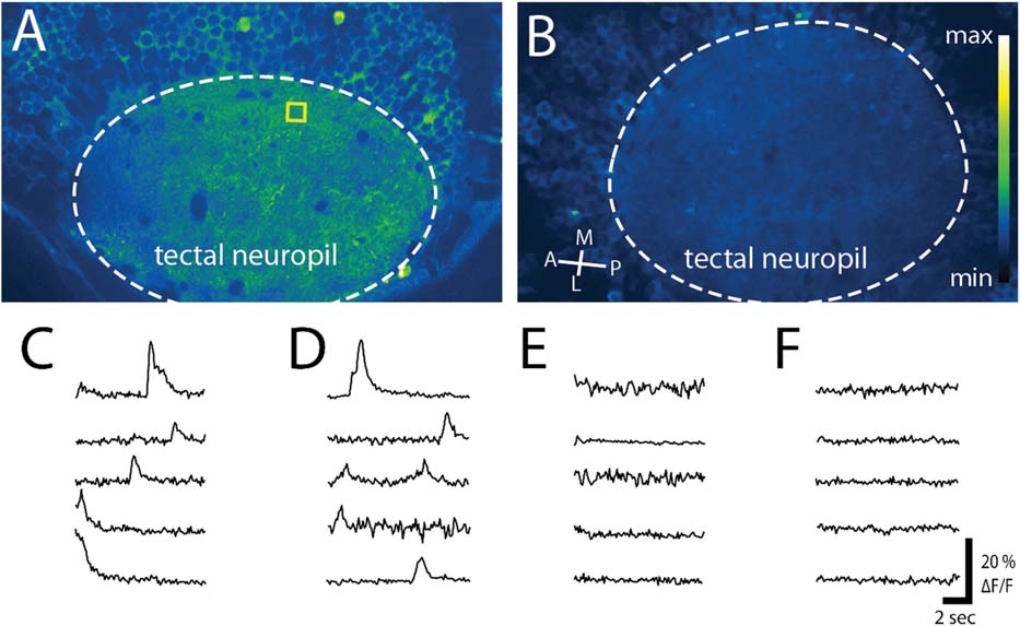 TTX reduced both spontaneous and induced activity in the tectal neuropil. (A,B) Images of the tectal neuropil in HuC:GCaMP5 fish at 4 dpf when injected (A) with a control (vehicle alone) or (B) TTX. 250 frames of each movie were stacked for maximum intensity over time and psuedocolored with an imageJ Look Up Table (Green Fire Blue) where yellow shows the most intense activity over a blue background. (C, D) Spontaneous activity, as well as activity induced by the initiation of the 488 nm laser, was observed in the tectal neuropil in control cases at (C) 4 dpf and (D) 5 dpf. (E, F) When injected with TTX at 3.5 dpf no spiking activity was observed in the neuropil at (E) 4 dpf or (F) 5 dpf. Yellow box in (A) shows an example of a 25 × 25 pixel region chosen for activity analysis. A; anterior, M; medial, P; posterior, L; lateral.