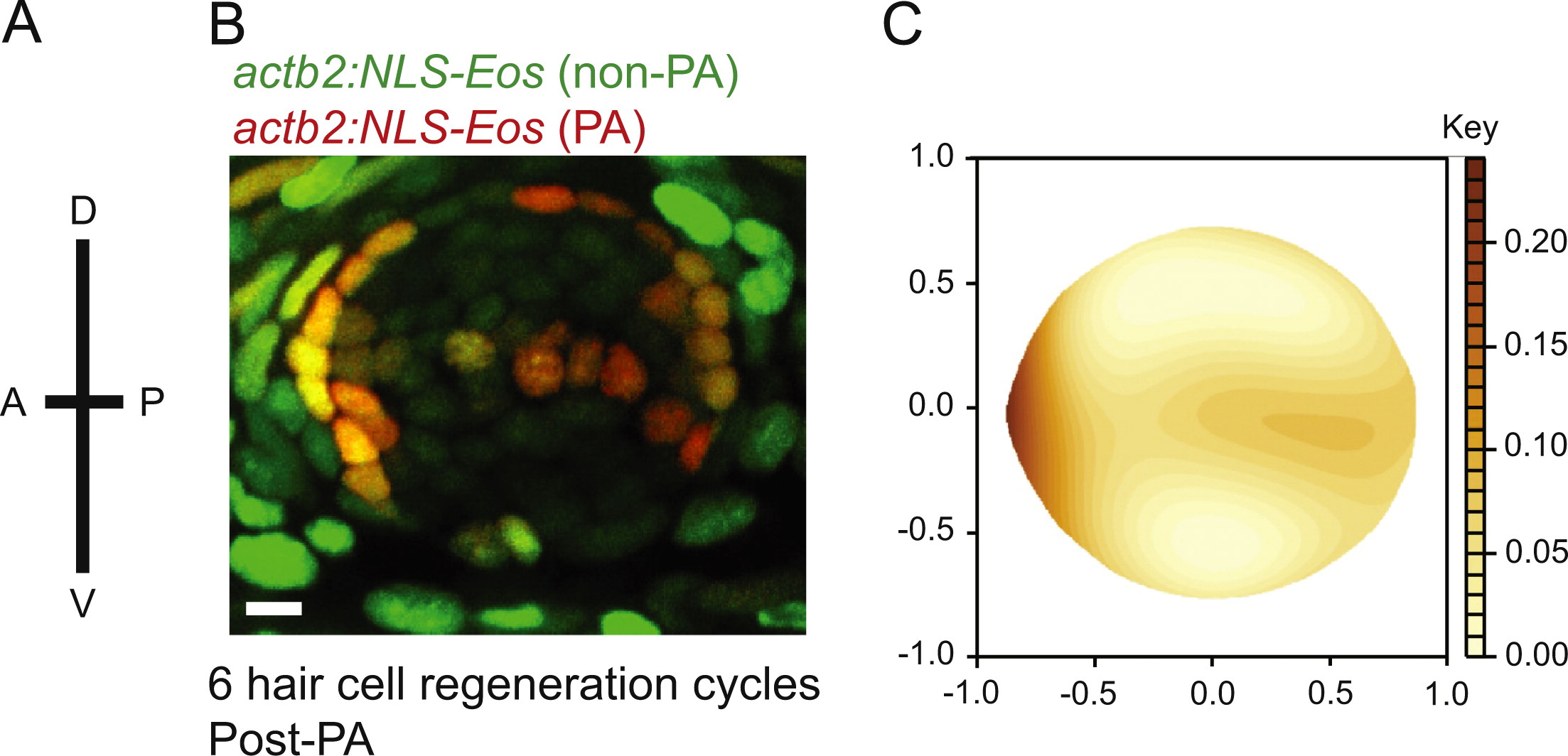 Label retaining support cells are localized to the anterior region of caudal fin neuromasts. (A) Schematic illustrating the orientation of neuromasts in the caudal fin that were analyzed; applies to panels B and C (B) representative z-stack confocal maximum projection image of an adult Tg(actb2:NLS-Eos) neuromast following entire neuromast Eos photoactivation (PA) and 6 sequential hair cell regeneration cycles. Scale bar, 10 µM. (C) Diagram illustrating the distribution of label retaining cells using the red fluorescence intensity smooth median regression of 23 overlaid neuromasts. N=4 adult zebrafish.