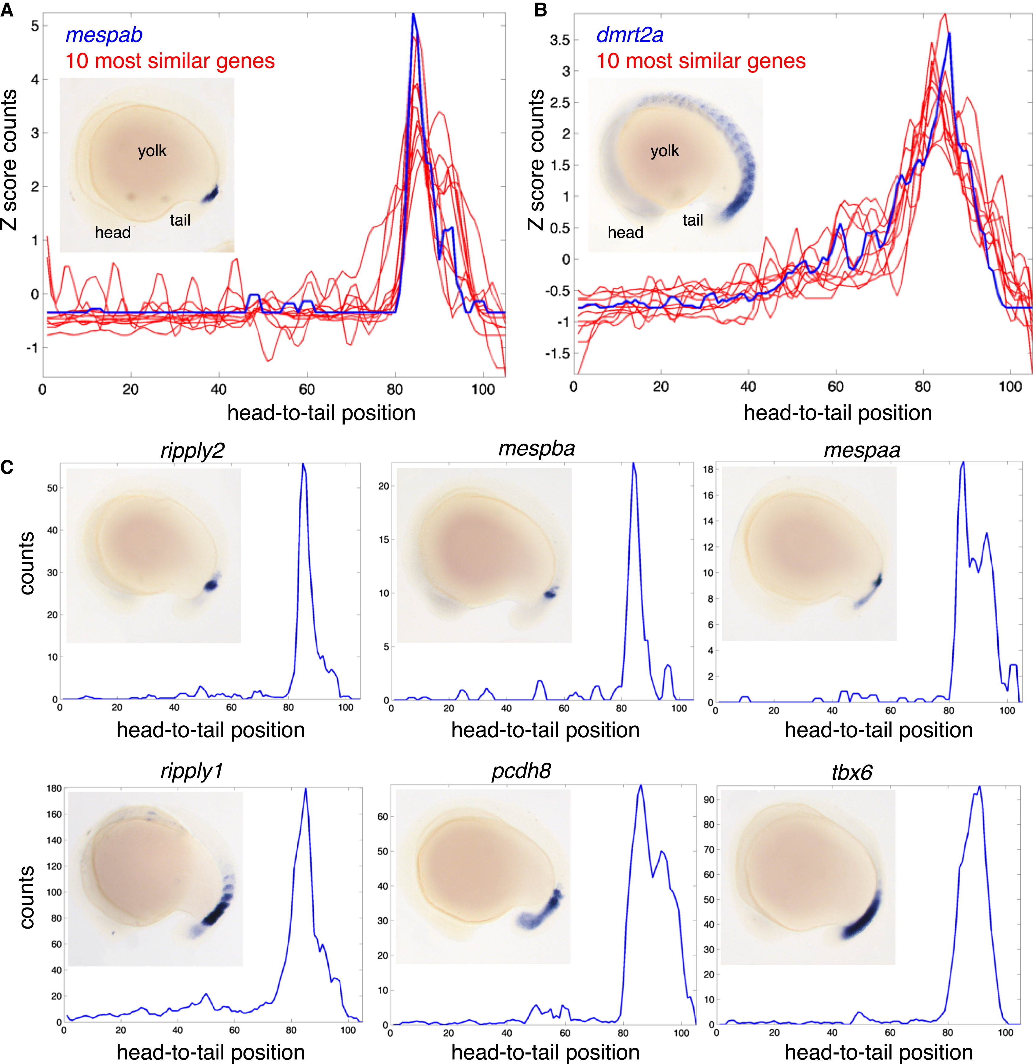 (C) Tomo-seq expression traces and whole-mount in situ hybridization images for six genes that are similar to mespab. All in situ hybridizations are lateral views, anterior to left.