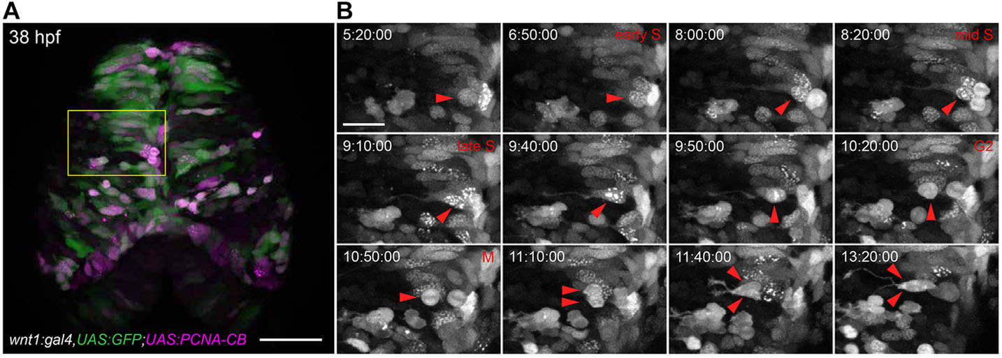 Cell cycle analysis of transgenic zebrafish embryos expressing PCNA-CB. (A) Overview of the dorsal midbrain of a wnt1:gal4,UAS:GFP (green); UAS:PCNA-CB (magenta) double transgenic embryo at 38hpf. (B) Unaltered cell cycle progression in PCNA-CB-expressing, wnt1-positive neural progenitors. PCNA-CB signal transitions from a speckled configuration (S phase) to an evenly distributed one (G2), which precedes mitosis (M). Arrowheads indicate a cell progressing through its last cycle before terminally differentiating into two daughter neurons. Time-stamps: h:min:s. Scale bars: 50µm in A; 20µm in B.