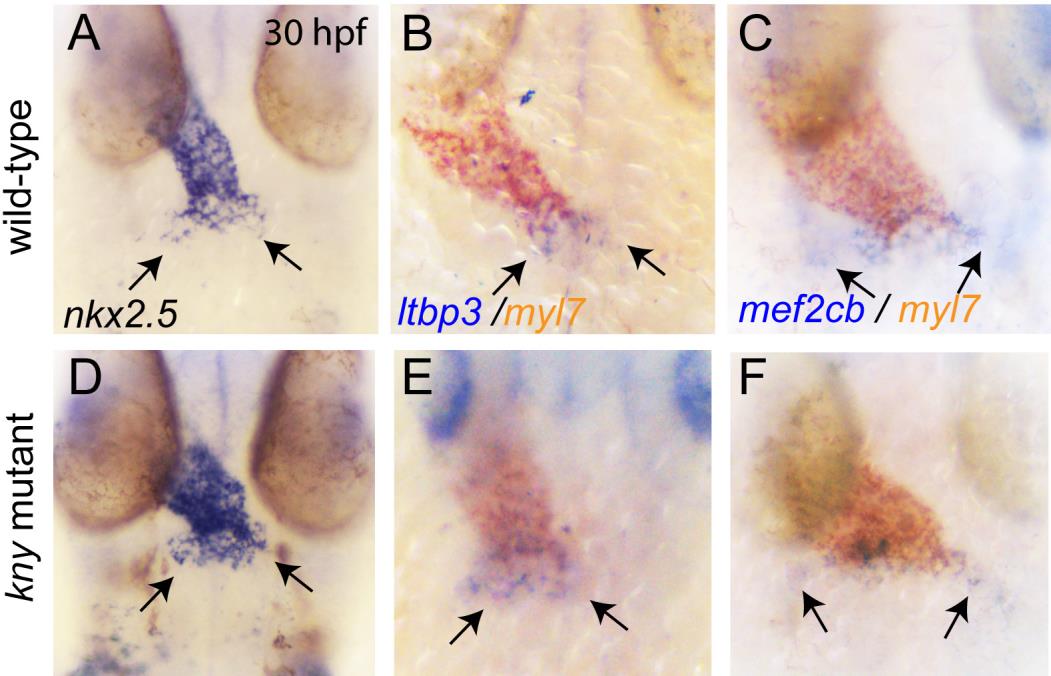 Related to Figure 2: Specification of the SHF occurs in kny/gpc4 mutants. (A-F) Dorsal view of wild-types (A-C) and kny/gpc4 mutants (D-F) at 30 hpf. In situ hybridization was carried out for nkx2.5 (A,D), ltbp3 (blue) / myl7 (orange) (B,E) and mef2cb (blue)/myl7 (orange) (C,F). Arrows indicate staining in the SHF.