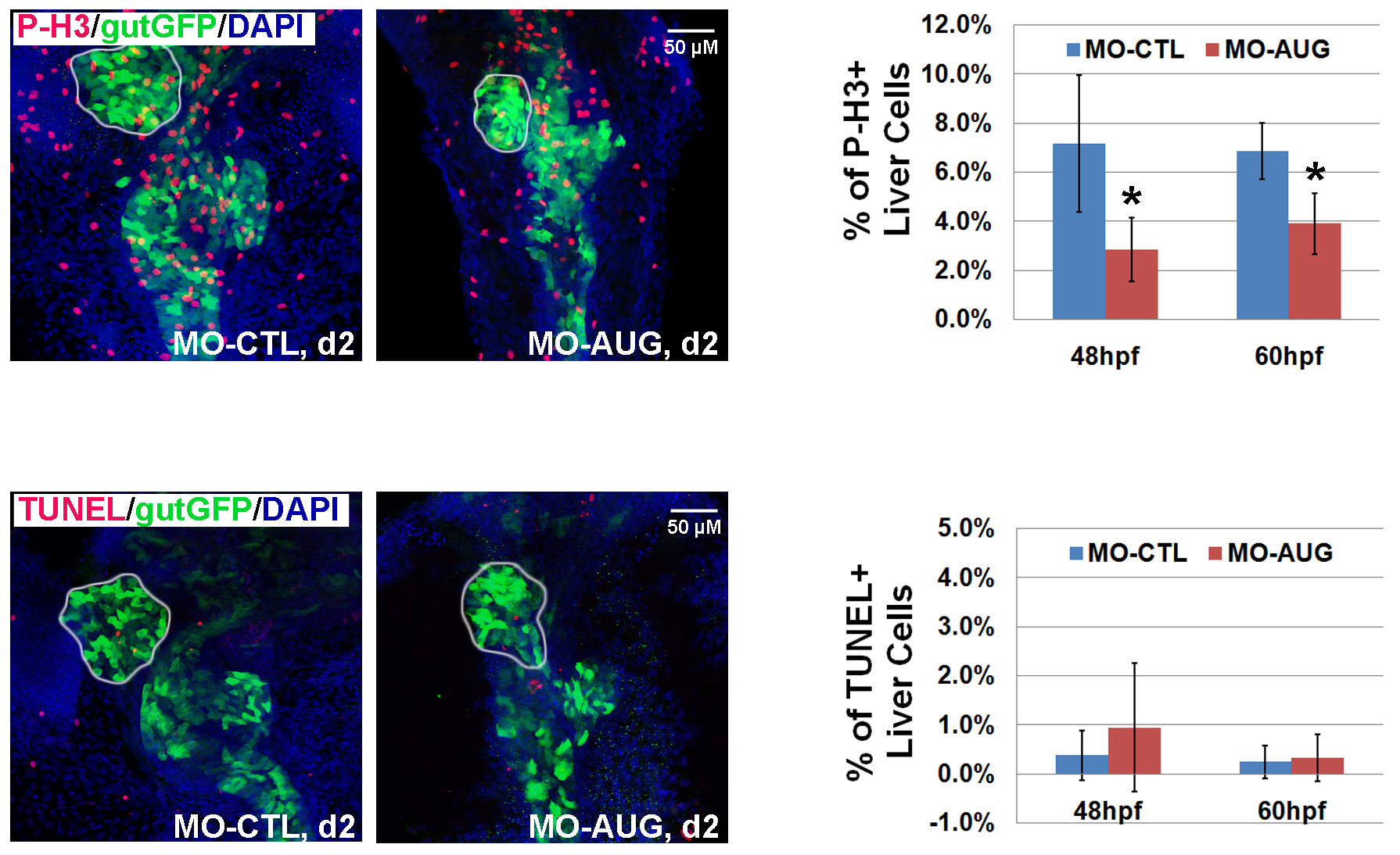 Fig. 4 Zfyve9a regulates the proliferation but not survival of hepatic cells. (A) Representative images of P-H3 staining of embryos at day 2. Green indicates the GFP-labeled endoderm cells. The outlined area is the liver. (B) Statistical results of the percentage of P-H3 positive hepatic cells in MO-CTL or MO-AUG injected embryos at 48 and 60 hpf. Stars indicates P<0.05 as analyzed by the t-test method. (C) Representative images of TUNEL assay at day 2. (D) The percentage of apoptotic hepatic cells in MO-CTL or MO-AUG treated embryos at 48 and 60 hpf. Error bars in (B) and (D) present the SD.