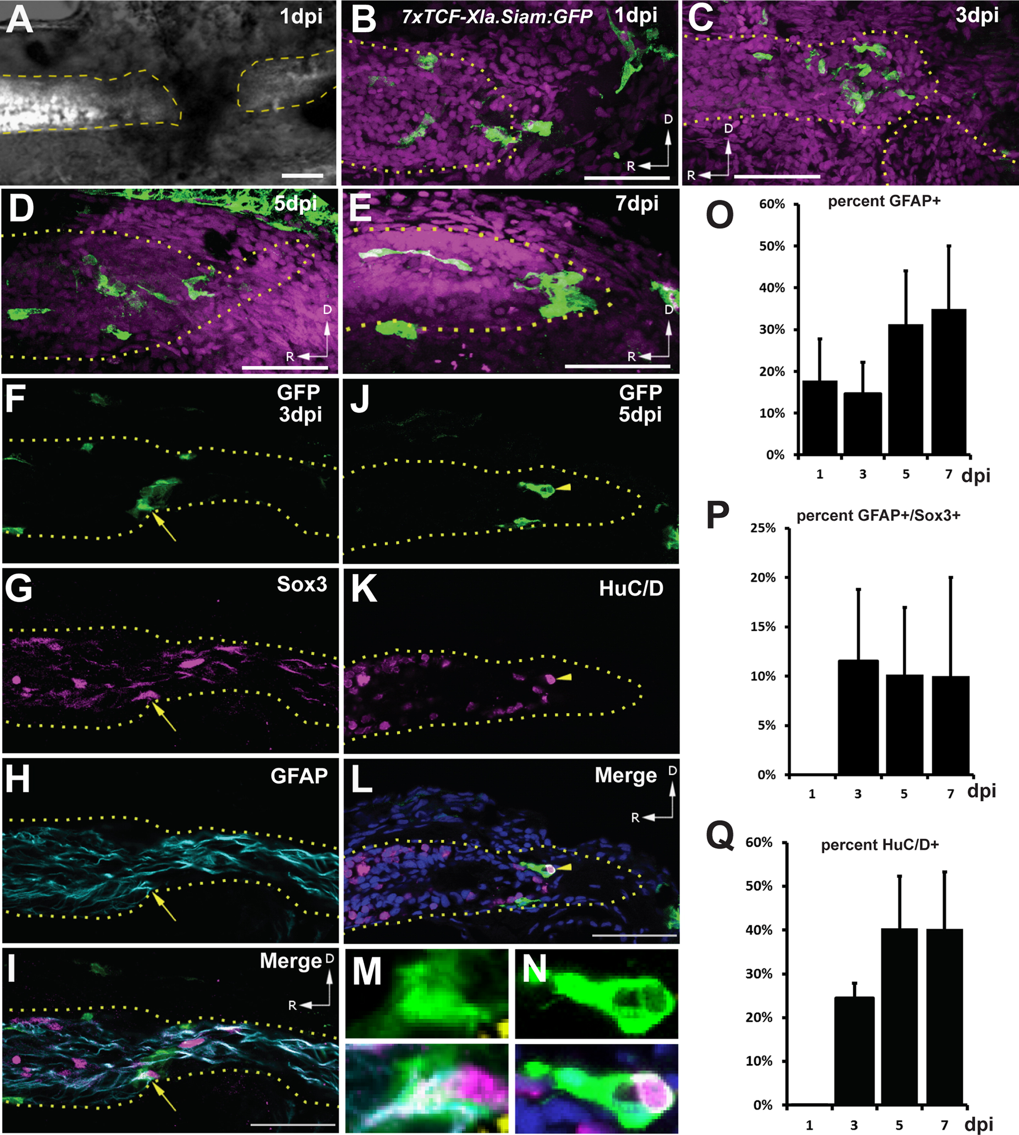 Wnt reporter expression after SCI. (A) Lateral view of a transected spinal cord at 1 dpi showing loss of neurons (white, labeled by elavl3:EGFP) at the injury site. (B–E) The 7xTCF-Xla.Siam:GFP Wnt reporter (green) is expressed in the regeneration blastema from 1 to 7 dpi. Magenta channel is nuclear staining. (F–I) Wnt reporter-expressing cells express GFAP and Sox3 at 3 dpi (arrow). (J–L) Other reporter-expressing cells are HuC/D+ neurons at 5 dpi (arrowhead). Blue channel is nuclear staining. (M,N) High-magnification views of co-labeled cells from panels (I and L). Percentage of GFP+ cells co-expressing GFAP, GFAP and Sox3, and HuC/D. Image in (A) is merged from fluorescent and brightfield channels obtained with a compound microscope. Images in (B–N) are single confocal slices from lateral views of whole-mounted larvae. Scalebars=50 µm, dashed/dotted lines outline the spinal cord, and D/R arrows indicate dorsal and rostral, respectively. For (O–Q), n=5 sections at each timepoint; error bars=SEM.