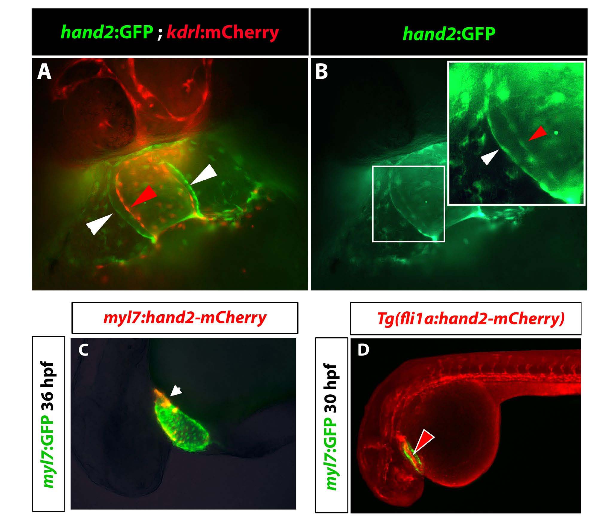 (A,B) Fluorescent imaging of cardiac region in hand2:GFP; kdrl:mCherry transgenic embryos at 35 hpf. (A) kdrl:mCherry+ endocardial cells are shown in red and hand2:GFP+ myocardial cells in green. (B) GFP channel shows both myocardial (white arrowhead) and endocardial cells (red arrowhead) labeled with hand2:GFP. (C) Mosaic expression of injected myl7:hand2-mCherry construct overlaps with Tg(myl7:GFP) fluorescence at 36 hpf. Fluorescence in lightly fixed embryos is shown. (D) mCherry fluorescence is observed in the vasculature and the endocardium at 30 hpf in lightly fixed Tg(fli1a:hand2-mCherry); Tg(myl7:GFP) embryos.