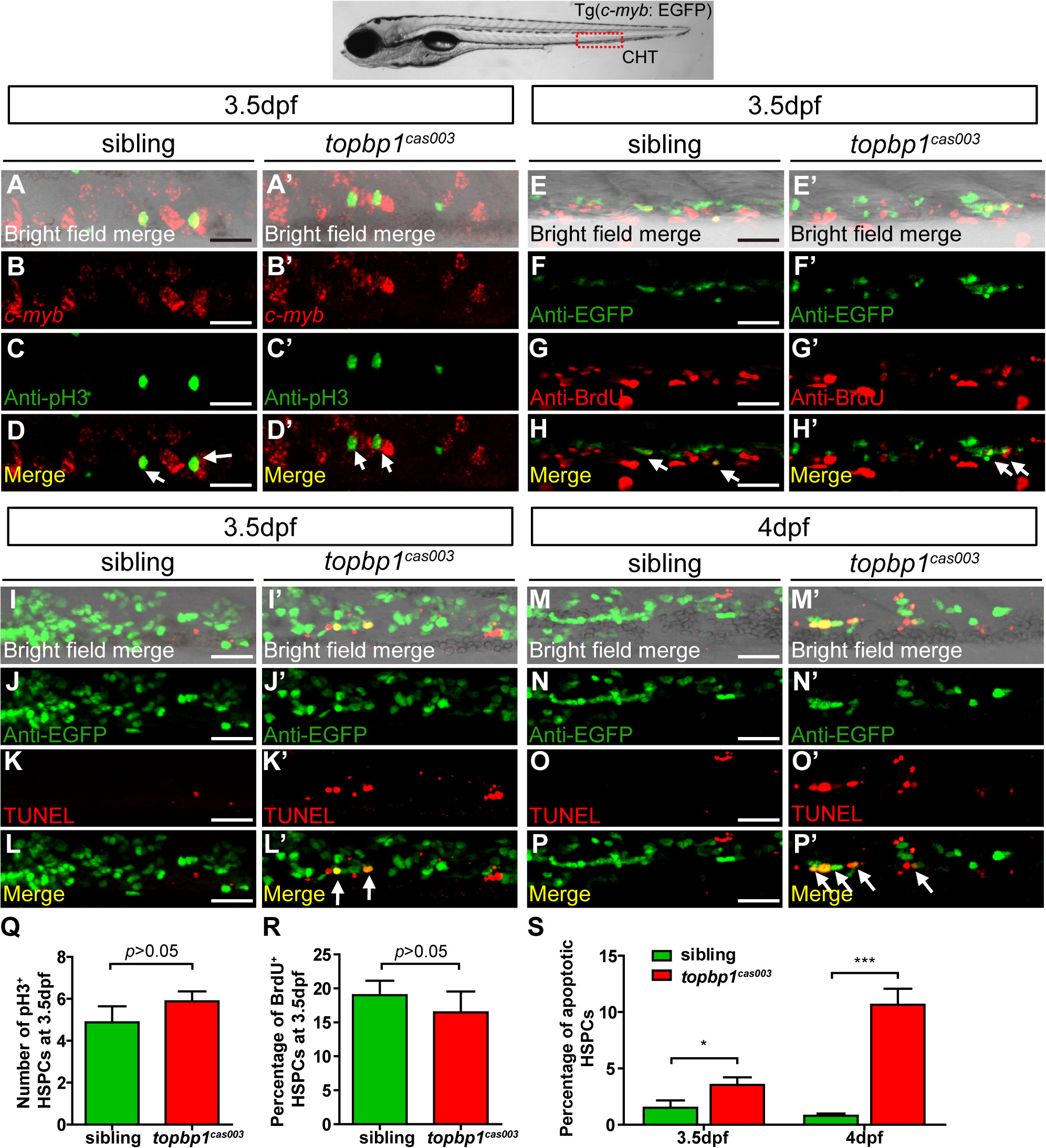 (A-D′) The c-myb in situ hybridization and phospho-histone H3 (pH3) immunostaining at 3.5dpf in sibling and topbp1cas003 mutant embryos, indicating no significant difference in the number of pH3+ HSPCs (pH3 and c-myb double positive cells, white arrows) between wild-type sibling and topbp1cas003 mutant embryos. The images show the stain in the enlarged CHT region. Scale bars represent 25µm. (E-H′) Double immunostaining of c-myb: EGFP and BrdU at 3.5dpf in the sibling and topbp1cas003 mutant embryos. The number of BrdU+ HSPCs (BrdU and EGFP double positive cells, white arrows) in topbp1cas003 mutant embryos is comparable to that in wild-type siblings. Scale bars represent 25µm. (I-P′) Double immunostaining of c-myb: EGFP and TUNEL at 3.5dpf (I-L′) and 4dpf (M-P′) in the sibling and topbp1cas003 mutant embryos. The apoptotic HSPCs (TUNEL and EGFP double positive cells, white arrows) are increased in the topbp1cas003 mutants comparing to siblings, which is more profound at 4dpf. Scale bars represent 25µm. (Q) Quantification of the number of the pH3+ HSPCs in sibling and topbp1cas003 mutant embryos at 3.5dpf. (R) Statistics result of the percentage of BrdU+ HSPCs at 3.5dpf. (Q) and (R) indicate no significant difference in the number of proliferating HSPCs between topbp1cas003 mutant embryos and siblings at 3.5dpf. (S) Quantitative analysis of apoptotic HSPCs in the CHT region in sibling and topbp1cas003 mutant embryos at 3.5dpf and 4dpf, showing the increased apoptotic HSPCs in the topbp1cas003 mutant embryos. For the Quantitative analysis, at least 6 embryos were analysis for each experimental group. Error bars represent SEM. *, p<0.05; ***, p<0.001.