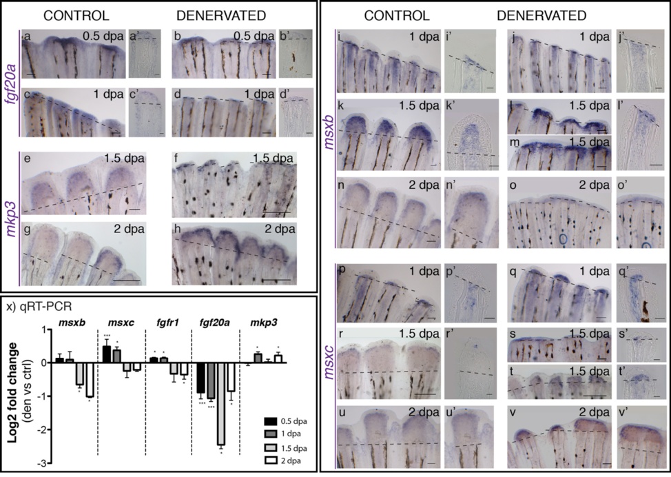 Gene expression in the blastema of control and denervated fins. a-v) mRNA ISH on whole mount amputated fins: fgf20a, mkp3, msxb, msxc.a′-l′, p′-t′) Longitudinal sections of the rays using whole mount ISH. a-d)Fgf20a expression is detected at 0.5 and 1 dpa in control fins (a,c) and only a residual expression is detected in denervated fins (b,d). e-k)Mkp3 is detected at 1.5 dpa in control (e) and denervated fins (f). At 2 dpa the expression in denervated fins is reduced but stronger (h) than in controls (g). i-o)Msxb expression starts at 1 dpa in both control and denervated fins. At 1.5 dpa denervated rays that have partially regenerated (m) present msxb expression spread in the inter-ray tissue (*). msxb expression is still detected at 2 dpa, however, in denervated fins is reduced to a thin domain (o). p-v)Msxc expression is present in both fins at 1 dpa, but with a stronger expression in denervated fins (q,q′). Expression is maintained after 1.5 dpa in non-regenerating (s,s′) and partially regenerating fins (t,t′). At 2 dpa, msxc is expressed as a continuum in the tip of partially regenerating denervated fins, in what seems a “merged blastema” (Adult zebrafish pectoral fin denervation assay.,v′). a,a′-v,v′) Dashed lines mark amputation plane. Scale bar - 100 µm in whole mount fins; 25 µm in sections. x) qRT-PCR for genes expressed in the blastema. qRT-PCR analysis shows an increase in the expression of msxc and fgfr1 on denervated fins at 0.5 and 1 dpa, as well as in mkp3 at 1 and 2 dpa, when compared to controls. Fgf20a levels of expression are always decreased in relation to the controls, as it is msxb at 1.5 and 2 dpa. Note: ***p < 0.0001, *p < 0.05.