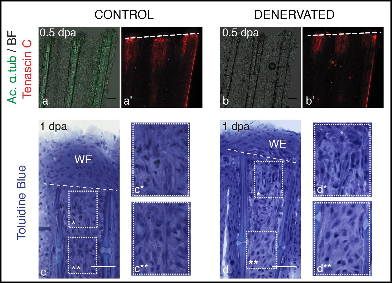 Mesenchymal tissue disorganization after amputation of denervated fins. a,b) Staining for Tenascin C and ac. α-tub in whole mount fins at 0.5 dpa. Tenascin C is present in the mesenchymal tissue under the amputation plane, both in control and denervated fins. c,d) Toluidine Blue histology in longitudinal sections. Longitudinal sections stained with toluidine blue show that at 1 dpa mesenchymal tissue becomes more disorganised below the amputation plane, with cells presenting a more elongated shape that suggests cell migration, in both control (c*) and denervated fins (d*), while more proximal mesenchymal tissue presents a more organized structure (c**, d**). a-d) The images are a projection of confocal optical slices. Dashed lines mark amputation plane. a,b) Scale bar - 100 µm. c,d) Scale bar - 50 µm.
