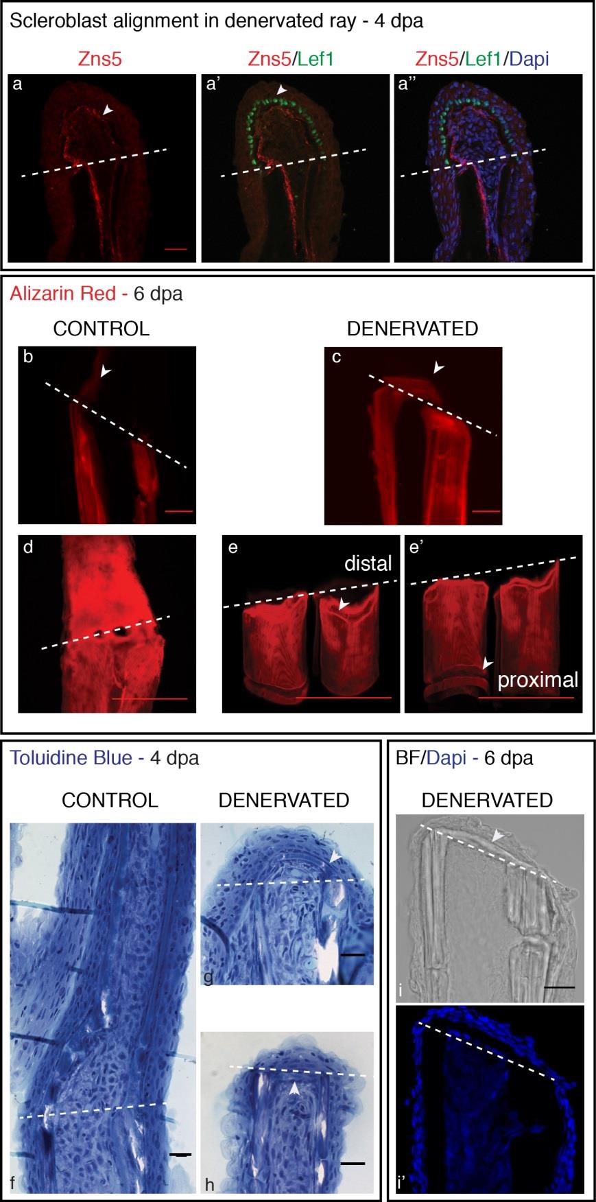 Bone deposition in the amputation plane of denervated fins. a) Staining in longitudinal sections for Zns5, Lef1 and DAPI. Zns5-positive cells accumulate below the BEL of denervated fins, forming an arch that delimits mesenchymal cells. Lef1 is ectopically expressed in the whole BEL (a′). b,c) Staining with ARS in longitudinal sections. Alizarin Red staining at 6 dpa shows mineralization of the newly formed ray along the old bony ray in control fins (b-arrowhead), while in denervated fins it shows bone deposition in at the amputation level (c -arrowhead). d,e) Staining with ARS in whole mount fins. The deposition of bone cells in the amputation site causes a thickening in the distal stump of deneravated fins. A 3D projection of denervated rays shows that the distal region (e-arrowhead) is comparatively thicker in relation to the proximal region (e′-arrowhead). f-h) Toluidine Blue histology in longitudinal sections. At 4 dpa cell deposition between the 2 hemi-rays is observed in denervated fins (g,h). The new structure resembling bone matrix seems to be derived from the old bone (g - arrowhead) and a group of cells, resembling bone cells, are deposited at the level of amputation almost closing the ray (h - arrowhead). i) DAPI staining in longitudinal sections. At 6 dpa a bright field image shows matrix deposition at the level of amputation between the two hemi-rays (arrowhead). a-e, i) The images are a projection of confocal optical slices. Dashed lines mark amputation plane. a,e) Scale bar - 25 µm. b-d) Scale bar - 50 µm.