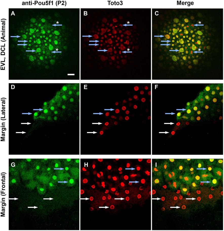 Distribution of Pou5f1 in enveloping layer (EVL), deep cells and yolk syncytial layer (YSL) of wild-type (WT) embryos. A–I: Confocal images of anti-Pou5f1 immunofluorescence (green) WT whole-mount embryos at 90% epiboly (A–C) and sphere (D–I) stages in which all cell nuclei were stained with Toto3 (red). Blue arrows indicate blastoderm cell nuclei and white arrows indicate yolk syncytial nuclei. Large nuclei in A–C are EVL nuclei. Pou5f1 was not localized to chromatin in dividing blastomeres (blue arrows with asterisk), and also not in yolk syncytial nuclei (white arrows). Blastoderm layer at the animal pole (A–C), lateral margin (D–F), and frontal margin (G–I) are shown.