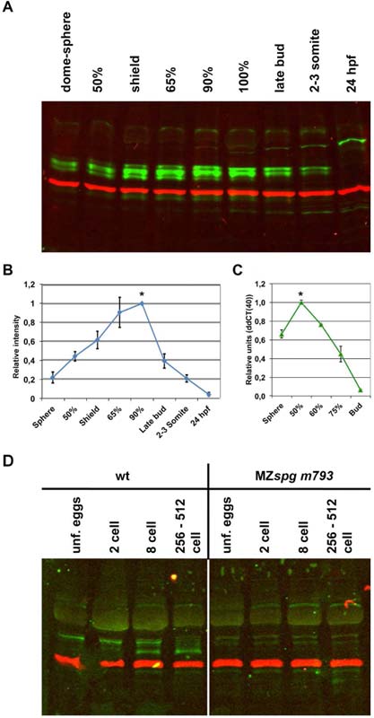 Temporal Pou5f1 profile during early embryo development. A: Pou5f1 protein amounts (green, around 60 kDa) from 4 hr postfertilization (hpf) to 24 hpf wild-type (WT) whole embryo extracts analyzed by fluorescent Western blot analysis. α-tubulin is shown as loading control (red, 55 kDa). In the Western blot, an additional faint higher molecular weight band is detected at approximately 150 kDa from mid-gastrula on, and a second band appears from the end of gastrulation at approximately 100 kDa. These bands are also present in MZspg embryos, and thus do not correspond to Pou5f1 forms but are nonspecific bands. B: Relative quantification of Pou5f1 immunoreactive band intensity from 4 to 24 hpf indicates that Pou5f1 protein amount is highest between 6 hpf (65% epiboly stage) and 10 hpf (100% epiboly stage). Pou5f1 band intensity values were normalized using the α-tubulin band intensity values. The Pou5f1 protein signal in WT at 90% epiboly stage was set to 100%. C: Relative quantification of pou5f1 mRNA message from 4 hpf (sphere) to 10 hpf (bud) by quantitative reverse transcriptase-polymerase chain reaction (RT-PCR). pou5f1 mRNA amount is highest at 50% epiboly stage and decays afterward. Elongation factor alpha (eef1a1a) was used as a normalization control. pou5f1 mRNA signal in WT at 50% epiboly stage was set to 100%. D: Pou5f1 at pre-MBT stages. Pou5f1 protein is already present in unfertilized eggs, but the band is shifted to higher molecular mass compared with a new Pou5f1 band that appears faintly at two-cell stage and then prominently from eight-cell stage on. The right part shows absence of Pou5f1 bands from MZspg mutant embryos. Fluorescent Western blot analysis using P2 Pou5f1 antibody (green) and anti-α-tubulin as loading control (red, 55 kDa).