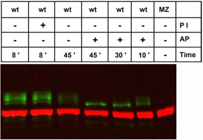 Pou5f1 modification by phosphorylation. Western blot analysis of 70% epiboly stage embryo extracts treated at 37°C with phosphatase inhibitor (PI) or alkaline phosphatase (AP) for defined periods (indicated at bottom). Pou5f1-positive protein bands were detected around 60 kDa in wild-type (WT) but reduced to a band of approximately 57 kDa molecular mass upon AP treatment. Anti-α-tubulin was used as loading control (red, 55 kDa).