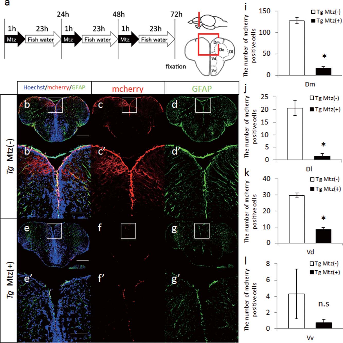 NTR-mediated RGC ablation in Tg(gfap:Gal4FF;UAS:nfsB-mcherry) adult zebrafish. a: Mtz treatment schedule for RGC-specific ablation. b–d: Expression of mcherry and GFAP in the telencephalon of adult Tg zebrafish after Mtz treatment. Sections of the telencephalon of Tg fish were stained with anti-GFAP (green) antibody. Nuclei were stained with Hoechst (blue). e–g: Expression of mcherry and GFAP in the telencephalon of adult Tg(gfap:Gal4FF;UAS:nfsB-mcherry) zebrafish. Sections of the telencephalon of Tg fish were stained with anti-GFAP (green) antibody. Nuclei were stained with Hoechst (blue). i–l: The number of mcherry-positive cells in the adult telencephalon with or without the Mtz treatment. Dm, Dl, and Vd. *P < 0.05. Scale bars, 200 µm in b and e, 100 µm in b′ and e′.