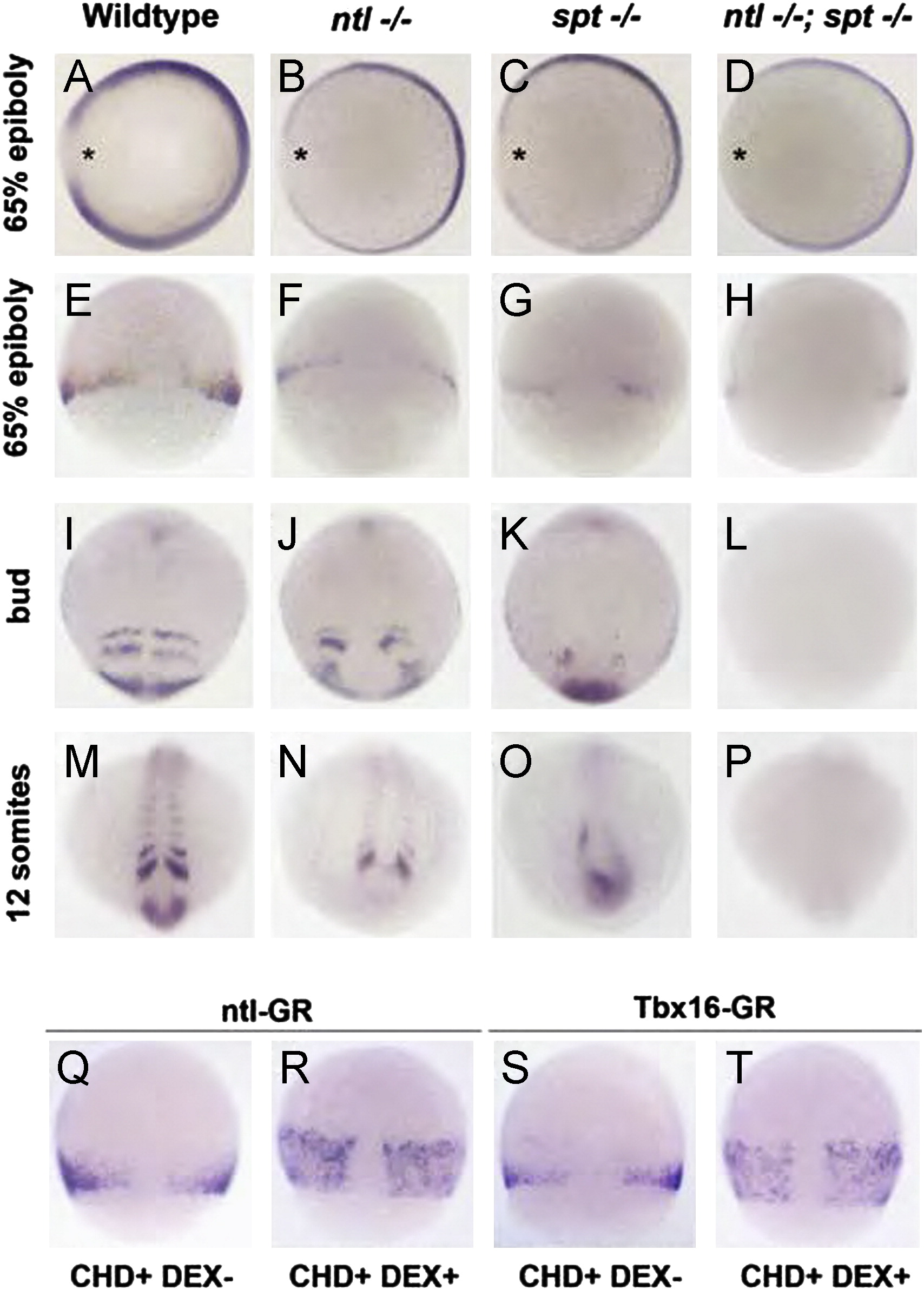 Ntla and Tbx16 directly regulate dlc expression (A)–(H) at 65% epiboly ntla-/- and spt-/- mutants have reduced dorsal-lateral expression of dlc, which is more pronounced in ntla-/-; spt-/- double mutants (asterisks). The vegetal-animal width of the expression is also reduced in mutant embryos. (I)–(L) At bud stage, dlc expression in ntla-/- mutants is similar to wild-type embryos, although somite shape is sometimes disrupted. Expression is much reduced in spt-/- mutants and absent in ntla-/-; spt-/- double mutants. (M)–(P) At 12 somite stage, dlc expression is absent from the posterior in ntla-/- mutants, but remains in the somites. In spt-/- mutants, expanded expression is seen in the tailbud, while expression is absent in ntla-/-; spt-/- double mutants. (Q)–(T) Normal expression of dlc is seen in embryos injected with Ntla-GR or Tbx16-GR and treated with cycloheximide (CHD). Addition of dexamethasone (DEX) together with cycloheximide, results in expanded dlc expression at the margin, indicating dlc is directly regulated by Ntla and Tbx16. (A)–(D) show animal views, dorsal to the left; (E) - ((H) and (Q) - (T) show dorsal views, animal to the top. (I) - (P) show dorsal views, anterior to the top.