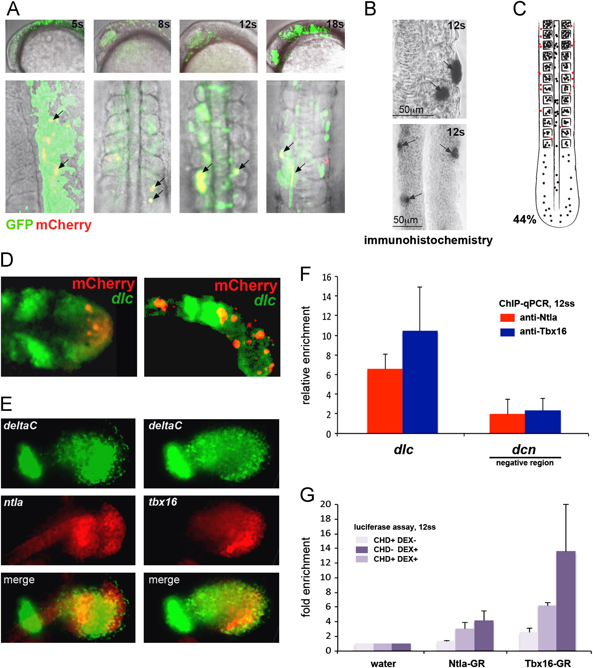 dlc CRM drives expression of reporter in tailbud, PSM and somites. (A) Confocal images of transient transgenics at 5, 8, 12 and 18 somite stages (5s, 8s, 12s, 18s) show mCherry expression (red; under the control of the dlc CRM) overlaps with GFP (green; under the control of a ubiquitous promoter) in the somites (arrows). Conversely, although strong GFP expression is seen in the nervous system, including the eye, mCherry expression is not seen here. (B) mCherry protein is detected in the somites by immunohistochemistry in 12 somite stage embryos (arrows). (C) Sites of mCherry expression detected by immunohistochemistry at 12ss (examples in (B)) were recorded and used to produce a representative composite of mCherry expression from 80 embryos. Black dots represent mCherry-expressing cells in the somites, PSM, tailbud or notochord; red dots represent mCherry expressing cells outside these tissues. 44% of embryos which expressed GFP also expressed mCherry in the somites, PSM, tailbud and/or notochord at 12ss. (D) Co-localisation of mCherry protein driven by the dlc CRM in the talibud (red) and endogenous dlc mRNA at 12 somite stage (green) shows overlapping expression. Left image is a dorsal view, right image is a lateral view. (E) Co-localisation of dlc mRNA (green) with ntla or tbx16 mRNA (red) at 12 somite stage shows overlapping expression in the tailbud. Lateral views are shown. (F) ChIP-PCR on 12-somite stage embryos using primers that amplify a region within the dlc CRM (see Fig. 1A and Table S1) show that dlc is bound by Ntla (red bars) and Tbx16 (blue bars) at this stage. For comparison, enrichment of binding around a negative region 2.2 kb upstream of dcn (see Table S1 for primer sequence) is shown. (G) Ntla-GR and Tbx16-GR activate luciferase expression through the dlc CRM in the presence of dexamethasone and cycloheximide at 12ss, indicating regulation by these factors is direct.