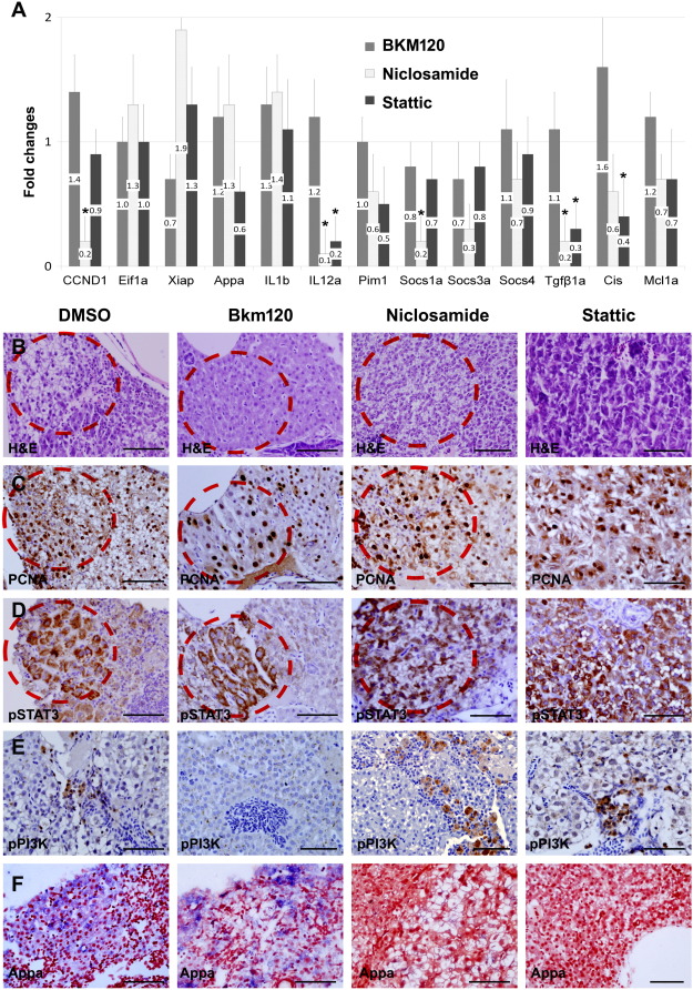 Drug inhibition assay on IL6 signaling pathway. (A) Real-time RT-PCR after inhibitor treatment (PI3K inhibitor BKM120 and STAT3 inhibitors Niclosamide and Stattic). Graphs are shown with mean values and standard error bars. The STAT3 inhibitors showed the decreased expression of the downstream components in the JAK/STAT3 pathway. No significant downregulation of the genes in the PI3K/Akt pathway was observed. The asterisk indicates the significant difference between the inhibitor-treated group and the control as determined by Mann-Whitney U test (P < .05). (B) H&E images. (C–E) IHC for PCNA, pSTAT3, and pPI3K after the drug treatment. BKM120 treatment showed downregulation of the pPI3K expression. pSTAT3 expression, however, was not completely suppressed by STAT3 inhibitor treatment. Note that pSTAT3 and PCNA were heavily expressed in the same dysplastic area of serial sections (red circles, sections from the same liver tissue). (F) ISH for Appa showing downregulation by STAT3 inhibitors. Bars, 50 µm.