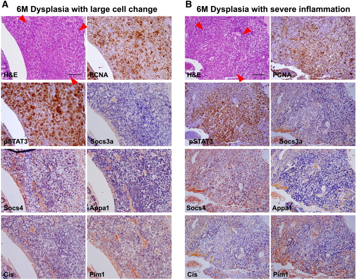 Activation of JAK/STAT3 pathway in serial sections. Red arrowheads indicate boundary of dysplastic foci. (A) Dysplasia with large cell changes. PCNA expression correlated with pStat3 expression. Inflammatory genes activated by JAK/STAT3 pathway are also expressed. (B) Dysplasia with inflammatory changes. Enhanced proliferation measured by PCNA expression precisely correlates with pStat3 expression. Downstream genes are also activated.