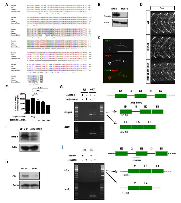 (C) Bnip-h is expressed in zebrafish motor neurons. The primary motor neurons were isolated from zebrafish larvae at 24 hpf and cultured for additional 48 hours before fixation and staining. Scale bar, 50 µm.