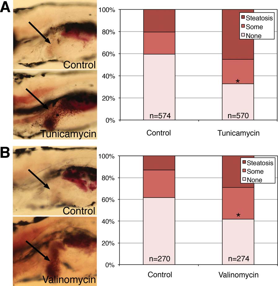 NASH-like phenotype in zebrafish larvae treated with the ER stress inducer tunicamycin or the oxidative stress inducer valinomycin. Larvae were placed in vehicle control or in tunicamycin or valinomycin at 5 dpf, then examined at 7 dpf. Larvae were fixed and then stained with ORO and the amount of steatosis was quantified. (A,B) Quantification of hepatic steatosis in control versus (A) tunicamycin-treated or (B) valinomycin-treated larvae. An example of each is shown, with the liver noted by the black arrow. Note the red punctate staining in the liver of the tunicamycin-treated and valinomycin-treated larvae. Quantification of steatosis is shown to the right, categorized as “steatosis,” “some” steatosis, or “none.” Shown are the percentages of each category in (A) control versus tunicamycin treated and (B) control versus valinomycin-treated larvae, and the total number of larvae in each condition is noted. Larvae with steatosis or some steatosis are increased in both the tunicamycin- and valinomycin-treated larvae in a highly significant manner (*P H 0 by chi-square analysis).