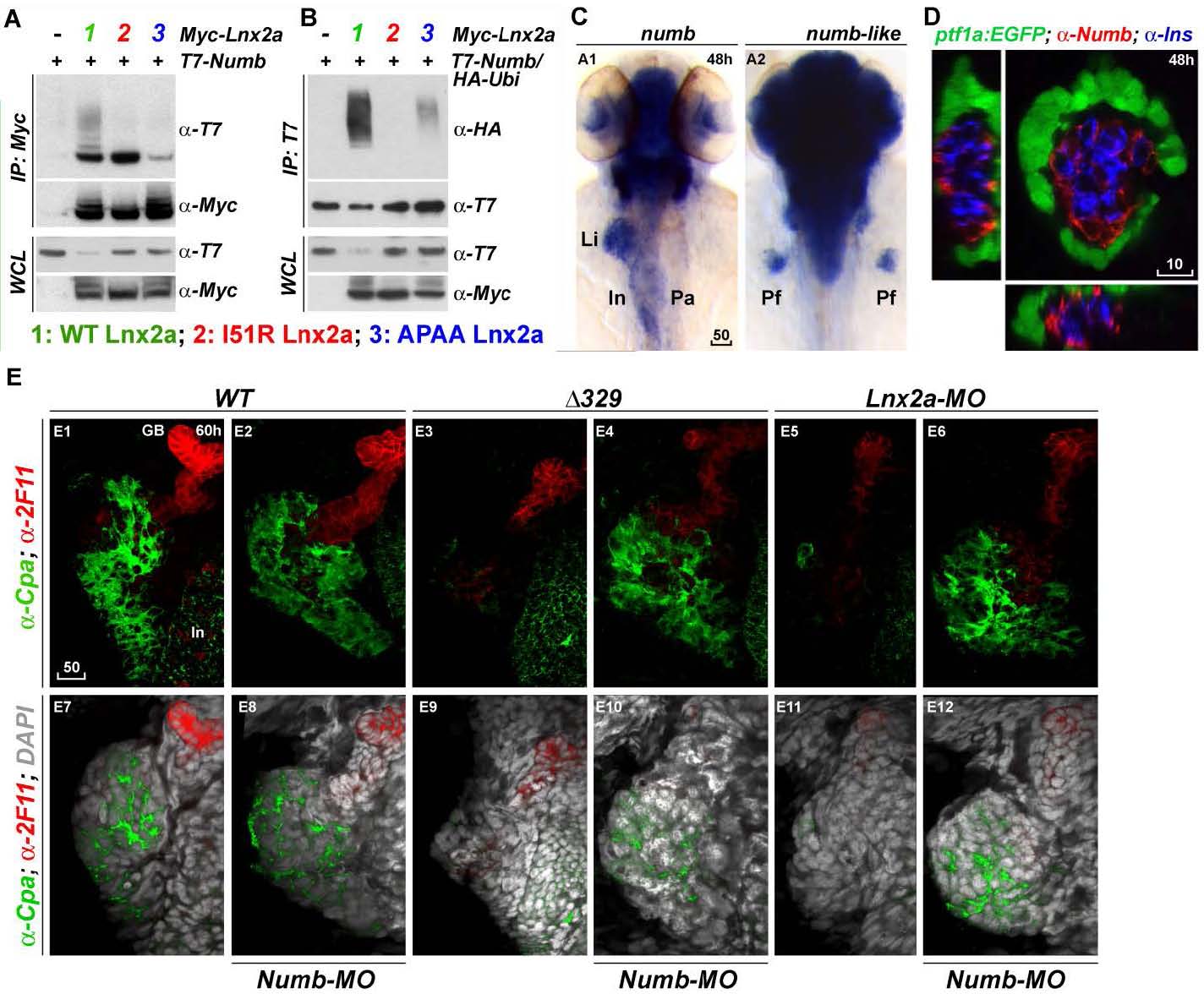 Fig. S5 Numb is a target of Lnx2a in the zebrafish pancreas. (A and B) Lnx2a is an E3 ubiquitin ligase that mediates the ubiquitination and degradation of Numb (16, 17). Myc-tagged WT Lnx2a and I51R and APAA mutants were co-transfected into 293T cells with T7-tagged Numb (A) and HA-tagged ubiquitin (B). After 36 h, immunoprecipitation and immuno blotting were performed with the indicated antibodies. (A) Numb interacts with WT and I51R mutant, but not with APAA mutant Lnx2a. In particular, co-immunoprecipitated Numb with WT Lnx2a was highly modified. (B) poly-ubiquitination of Numb was induced by WT Lnx2a but not by the I51R or APAA mutant. (C) Expression pattern of numb during early pancreas development. Transcripts of numb were detected in the whole pancreas, liver and intestine at 48 hpf, whereas numb-like was found in the brain but not in the endoderm. (D) Immune-staining with Numb antibody in Tg(ptf1a:EGFP) embryos reveals that Numb is expressed in the primary islet but not in ptf1a:EGFP+ ventral pancreas. At 48 hpf, Tg(ptf1a:EGFP) embryos were stained with anti- Insulin and anti-Numb antibodies, and confocal images in three axes are shown. (E) Immuno staining shows that exocrine pancreas defects in lnx2aΔ329 mutants and lnx2a-MO injected embryos are rescued by the knock-down of Numb. After numb-MO injection into WT siblings, lnx2aΔ329 mutants, and lnx2a-MO injected embryos, embryos were stained with anticarboxypeptidase A (α-cpa) and ductal cell-specific antibody 2F11, at 60 hpf. Stained embryos were analyzed by confocal laser scanning microscopy, and Z projections are shown. lnx2aΔ329 mutants and lnx2a-MO injected embryos showed defects in Cpa+ exocrine pancreas that could be rescued by knock-down of Numb. Li, Liver; In, Intestine; Pa, Pancreas; Pf, Pectoral fin; GB, Gall bladder; Scale bar, 50 µm (A and E) and 10 µm (B).