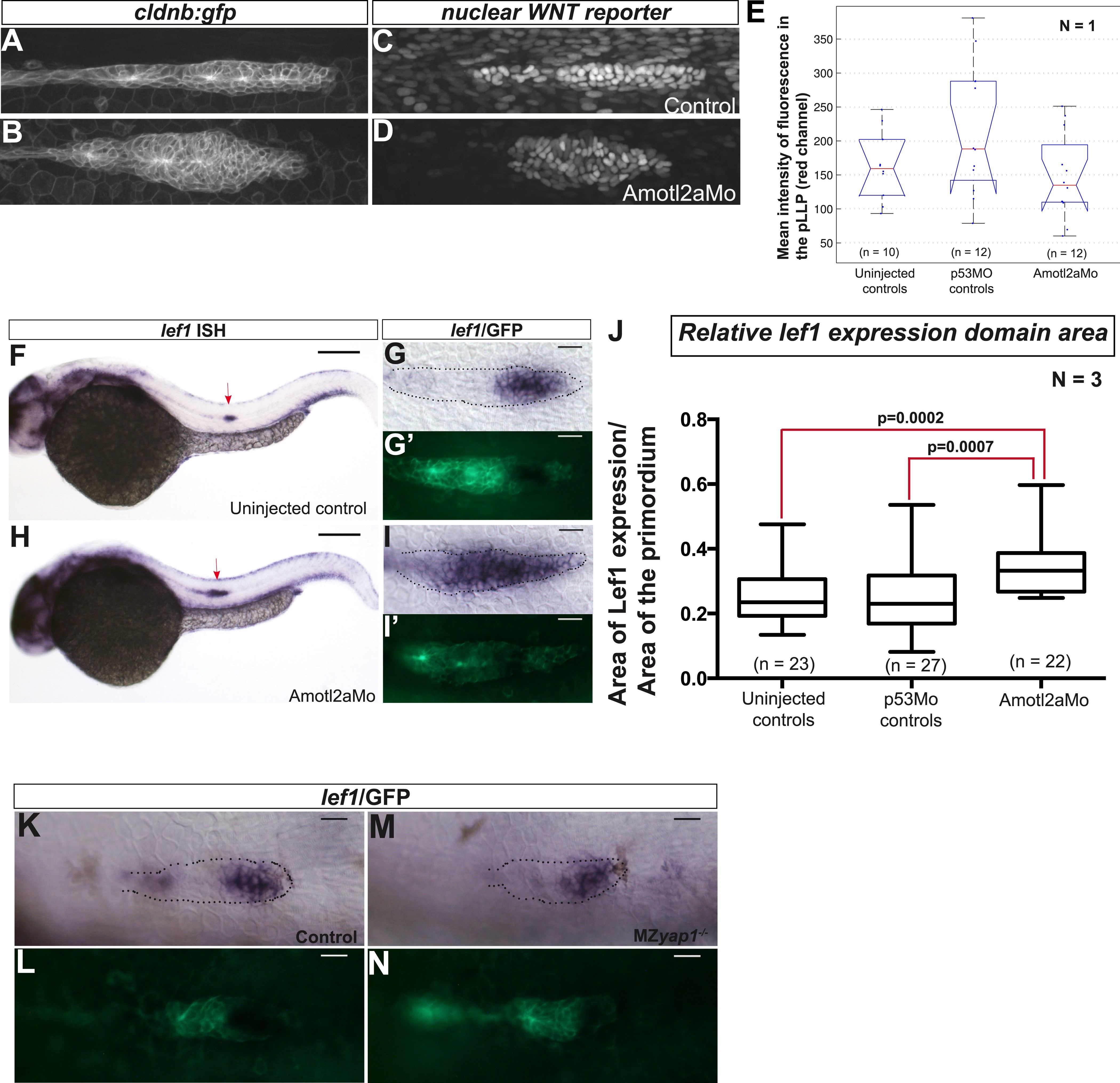 (A–D) MIP of confocal stacks of the pLLP in Tg(7xTCF-Xla.Sia:NLS-mCherry) embryos injected (B, D) or not injected (A, C) with the amotl2aMo and showing the green (membranes, left) and red (nuclear WNT reporter) channels. (E) Boxplot comparing the relative mean intensity of fluorescence in the red channel in the corresponding pLLP. (F–I′) Overview pictures (F, H) and close-up on the pLLP of 30 hpf cldb:gfp embryos injected (H, I, I′) or not injected (F, G, G′) with the Amotl2aMo and stained with a lef1 ISH probe and an anti-GFP antibody (G′, I′). Red arrows point to the pLLP (F, H). (J) Boxplot showing the expansion of lef1 expression domain in amotl2a morphants. (K–N) Close-up on the pLLP of 30 hpf control or MZyap1-/- cldb:gfp embryos stained with a lef1 ISH probe and an anti-GFP antibody (L, N). The relative lef1 expression domain is not different in MZyap1-/- embryos (Figure 7—source data 3).