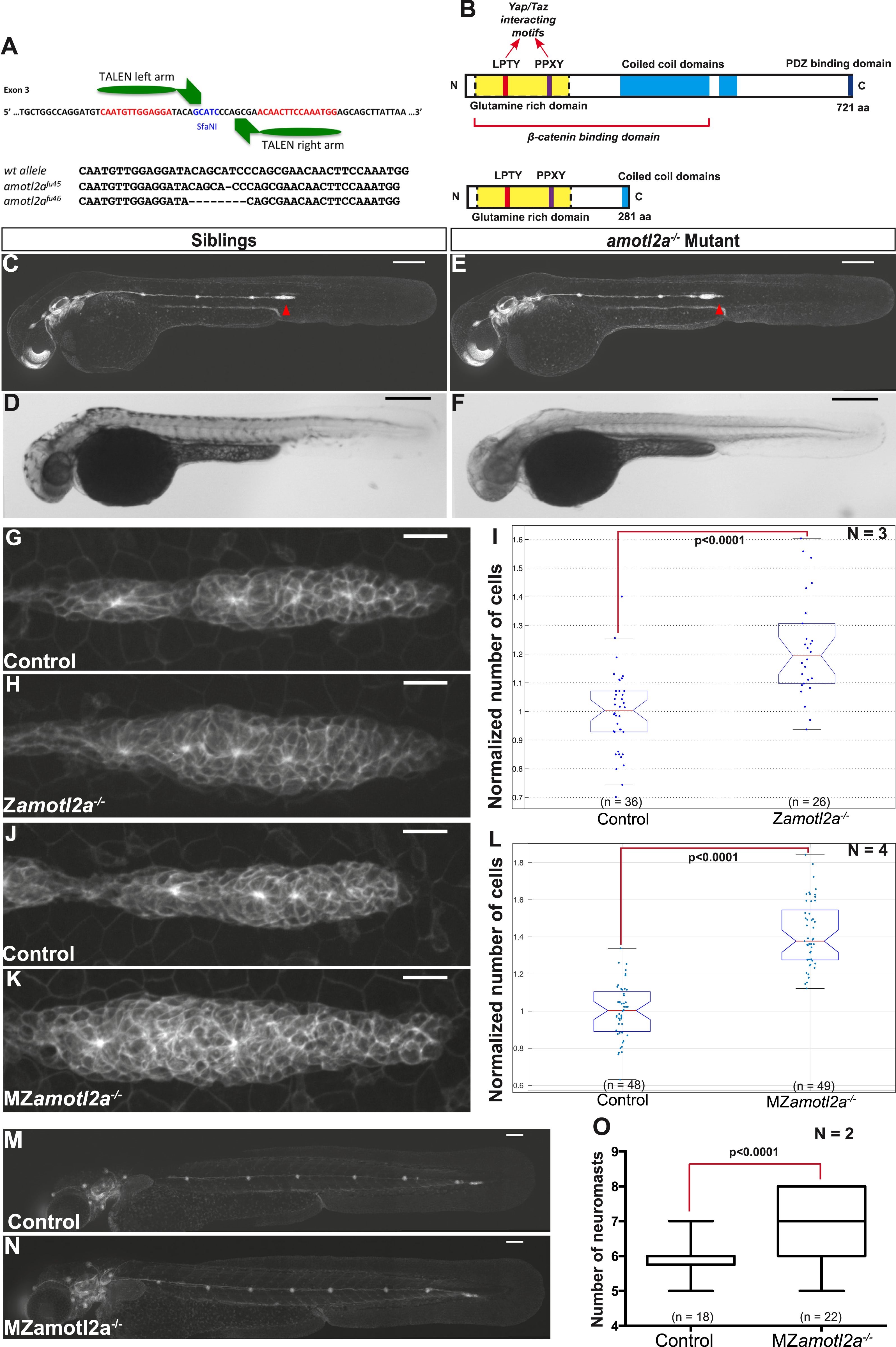 (A) Scheme showing the transcription activator-like effector nuclease (TALEN) target site in the amotl2a locus with the left and right TALEN-binding sites in red separated by the spacer including the restriction site used for screening (blue) (top). Alignment of the two conserved amotl2a mutant alleles with the corresponding wild-type sequence showing the deleted nucleotides (bottom). (B) Scheme comparing the functional domains present in the wild-type Amotl2a protein (721aa long) and the putative truncated proteins (272aa +17 or +9 missense aa for allele fu45 and fu46, respectively). (C–F) 36 hpf cldnb:gfp wild-type sibling (C, D) or amotl2a/ mutant embryo (E, F) imaged with fluorescent (C, E) or transmitted light (D, F). (G, H, J, K) MIP of Z-stacks of pLLP in cldnb:gfp embryos with the indicated genetic background. (I, L) Boxplots comparing the cell numbers between the indicated genetic backgrounds. (M, N) MZamotl2a/ mutant embryo (N) showing an extra deposited neuromast as compared to a wild-type sibling embryo (M). (O) Boxplot showing the corresponding quantification (Figure 4—source data 1, 2; Figure 4—figure supplements 1, 2, Figure 4—source data 3, 4).