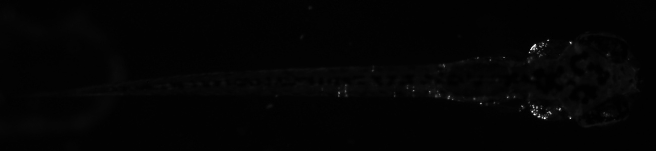Fig.12 View of larva transgenic for y434Et and Tg(UAS:Kaede)s1999t, which expresses Kaede in yolk (plus extension;punctate cells), medulla oblongata (caudal cluster) and puncta loosely clustered under otic vesicle and jaw.