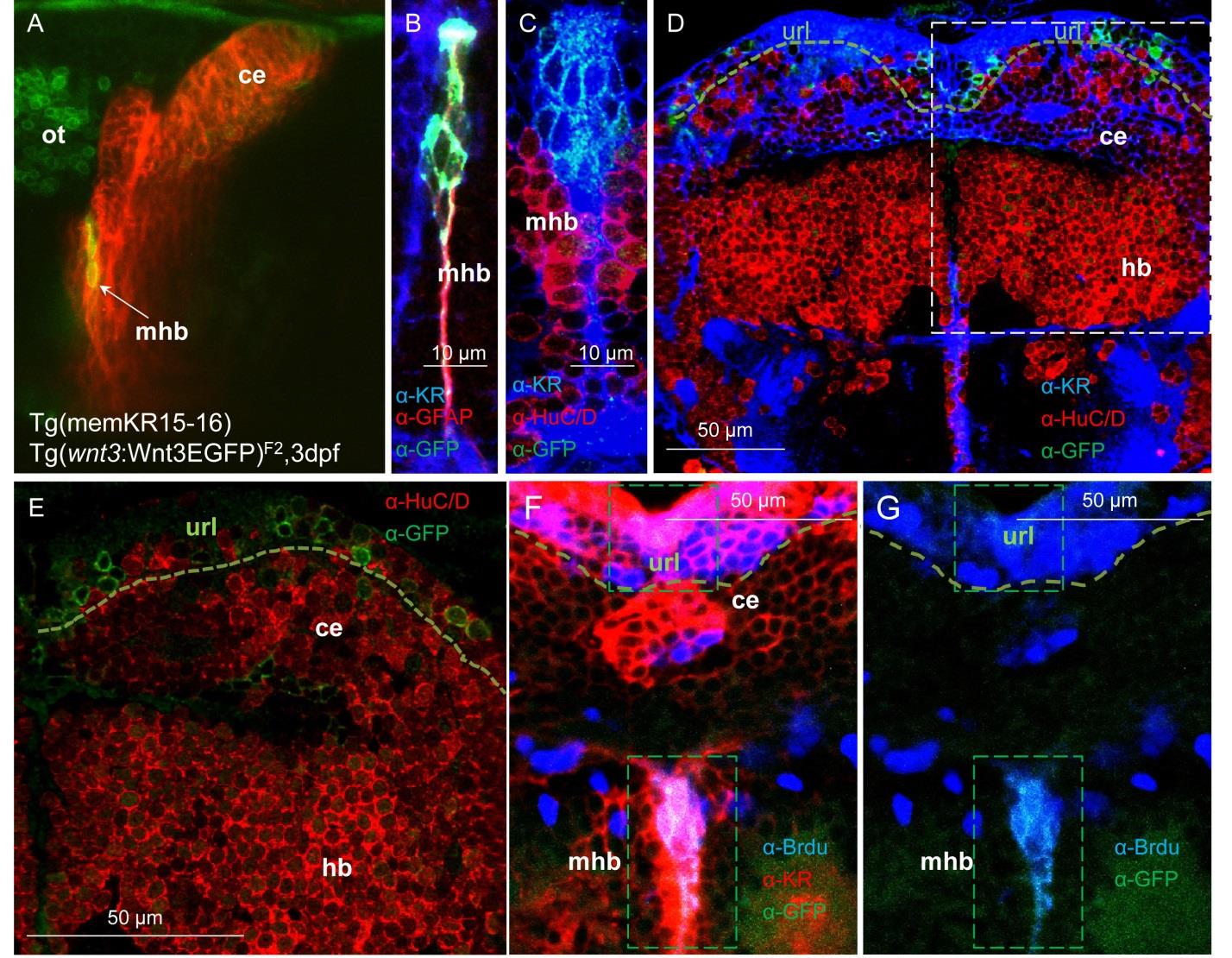 Fig. S2 Cells expressing Wnt3EGFP in the midbrain hindbrain boundary and cerebellum are located in proliferation niches. (A) An in vivo image of a double transgenic larvae co-expressing the membrane localized KillerRed in the midbrain hindbrain boundary (mhb) and cerebellum of Tg(memKR15-16) and C terminal EGFP Wnt3 fusion proteins from Tg(wnt3:Wnt3EGFP)F2. Double transgenic larvae confirmed Wnt3EGFP expression in the mhb and the cerebellum. wnt3:Wnt3EGFP+ cells in the cerebellum are predominantly localized to the upper rhombic lip (url). (B-E)Wnt3EGFP cells at midbrain hindbrain boundary (mhb) are glial cells (B) as it stained positively for GFAP (glial fibrilary acidic protein) and are negative for the neuronal marker HuC/D (C-E). (F-G) Midline restricted Wnt3EGFP cells at midbrain hindbrain boundary (demarcated by membrane KR expression in this domain) are proliferating cells since they stained positively for Brdu.
