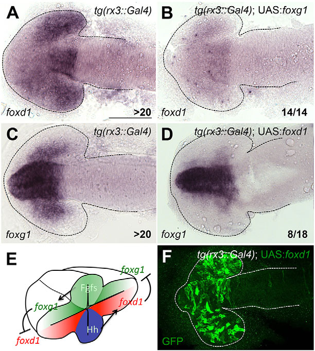Mutual repression between foxg1 and foxd1 maintains the NT border. (A-D) foxd1 (A,B) and foxg1 (C,D) expression in the conditions detailed in the panels. All panels show dorsal views with anterior to the left at 10-12ss. (E) Schematic representation of the regulatory interactions inferred from our manipulations. (F) Representative Tg (rx3:Gal4); UAS:foxd1 embryo showing widespread GFP expression in the optic vesicles. All embryos selected for in situ analysis showed similarly broad GFP expression. Scale bar: 100µm. Numbers in the bottom-right of each panel indicate the number of embryos with the phenotype shown out of the total number of embryos analysed. Dashed lines outline the forebrain.
