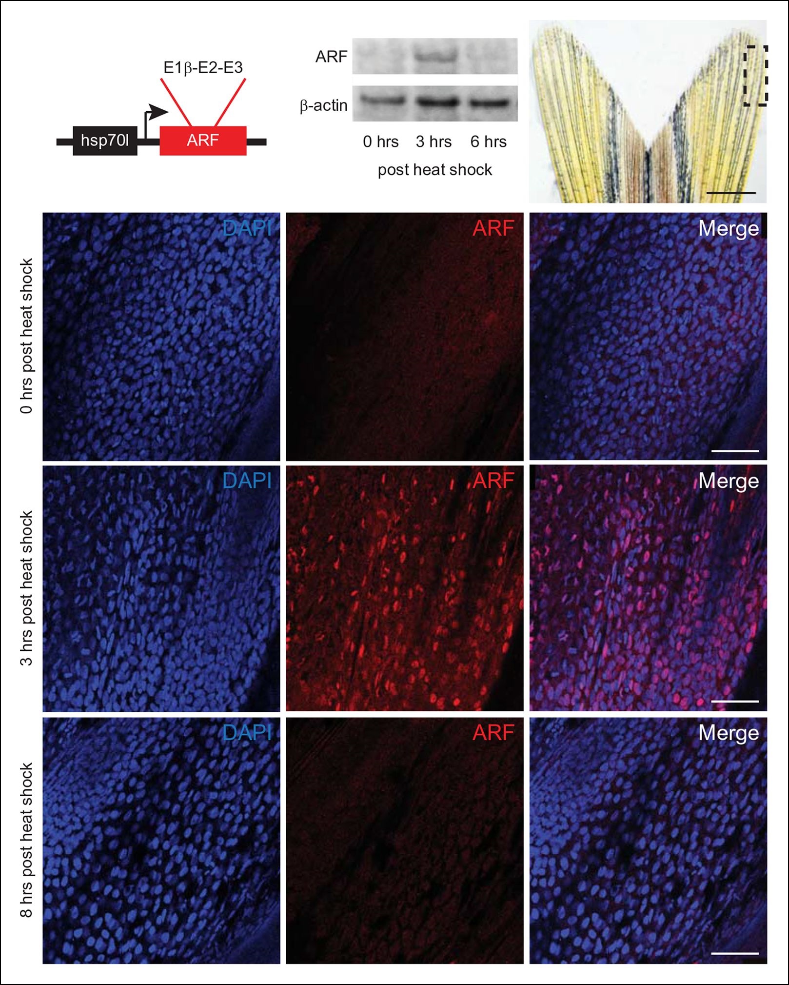Expression of the mammalian tumor suppressor ARF in zebrafish driven by heat shock promoter. In vivo analysis of transgenic zebrafish expressing human ARF under the control of an inducible heat shock promoter, Tg (hsp70l:ARF) (hs:ARF). Schematic of the hs:ARF transgene (top left). The ARF cassette included in the transgene is a cDNA that consists of human exons 1b, 2, and 3 of CDKN2A. Representative Western blot of 3 replicates of ARF before (0 hr) and 3 and 6 hr post heat shock induction of ARF expression (top middle). Portion of fin shown for analysis of expression in vivo (top right; dashed box). Scale bar: 1 mm. Immunostaining (sagittal confocal images) for ARF in adult hs:ARF zebrafish fins at 0, 3, and 8 hr after a single, hour long, 37°C heat shock (bottom). Scale bars: 50 µm. ARF expression is maximal at 3 hr post heat shock, and it is undetectable by 8 hr post heat shock. Figure supplement 1 shows in vitro assays.