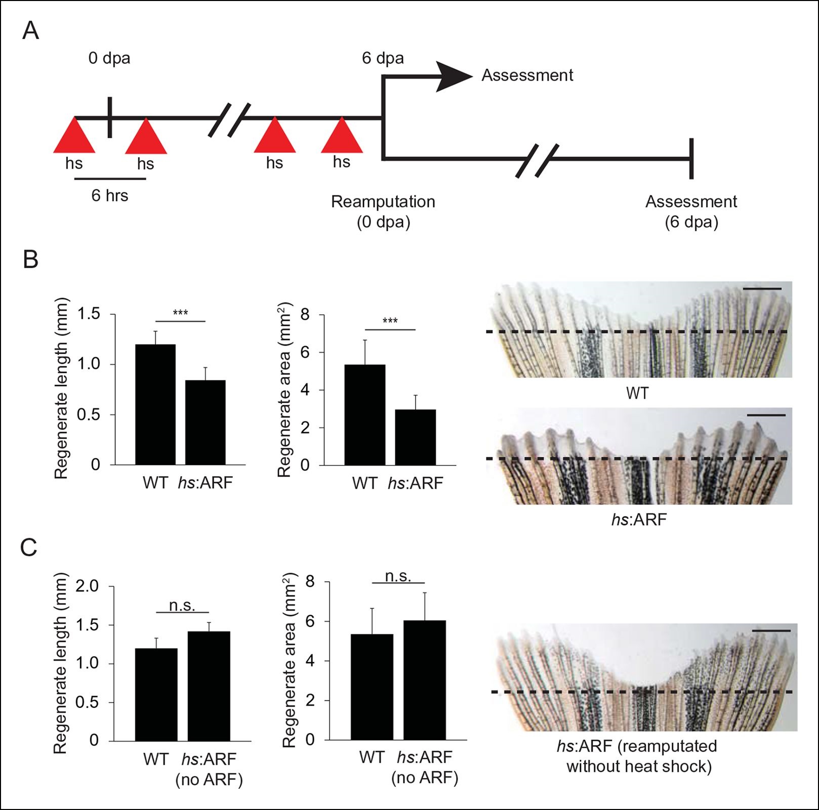ARF suppresses fin regeneration.(A) Schematic of heat shock regimen. An initial hour long, 37°C heat shock is delivered 3 hr prior to amputation (0 dpa) and then every 6 hrs thereafter for 6 days. Regenerates are then assessed (top) or fins are reamputated (0 dpa) and allowed to regenerate in the absence of heat shock for 6 days (bottom). (B) Quantification of regenerate length and area at 6 dpa in WT and hs:ARF fins exposed to the heat shock regimen (left; N = 40 fins representing multiple different transgene insertions, p<0.001). Representative images of fin regeneration at 6 dpa in WT and hs:ARF fins exposed to the heat shock regimen (right). (C) Quantification of regenerate length and area at 6 dpa in reamputated hs:ARF fins not exposed to heat shock (left; N = 40 fins, p>0.05). Representative image of fin regeneration at 6 dpa in a reamputated hs:ARF fin not exposed to heat shock (right). The dashed lines represent amputation planes. Scale bars: 1 mm. Results are shown as mean ± standard deviation. Figure supplement 1 shows ARF and Tp53 immunostaining at 4 dpa, and tp53 and cdkn1a expression changes with ARF expression. It also shows regeneration at 14 dpa after heat shock was discontinued at 6 dpa. hs: Heat shock; WT: Wild type.n.s.: not significant.