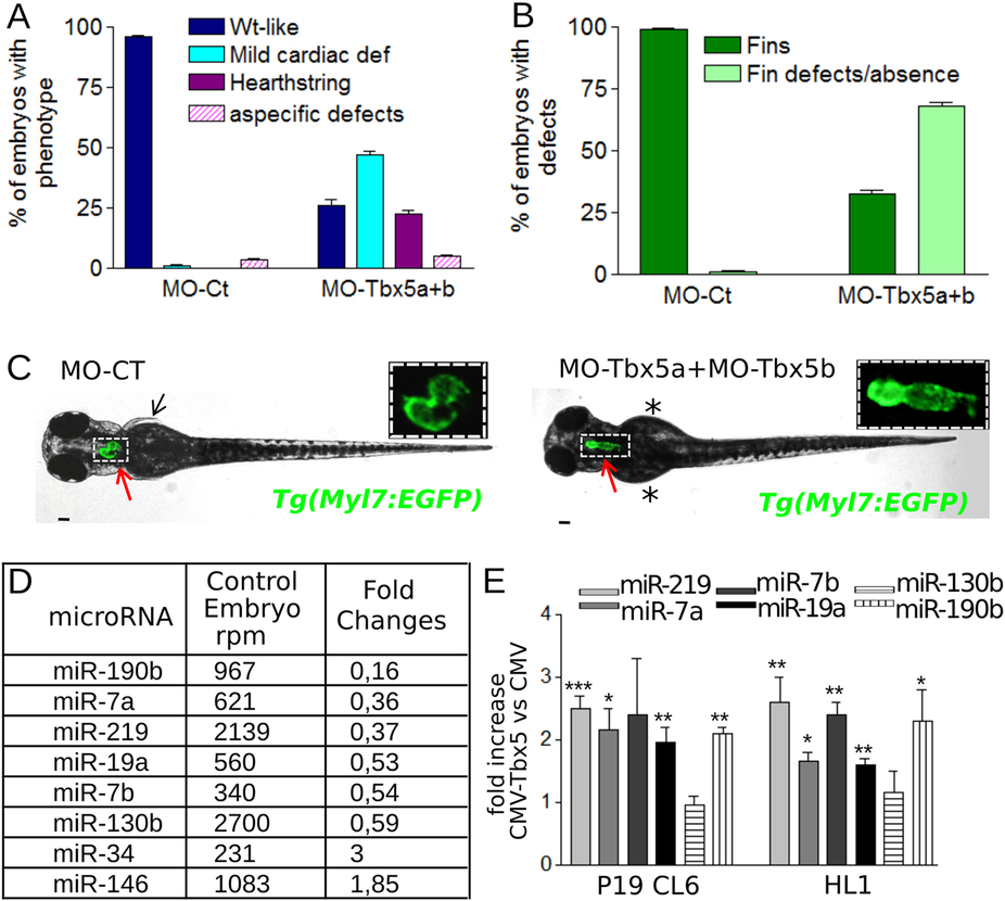 (A,B) Cardiac (A) and fin (B) analysis of 72 hpf embryos injected with 3 ng of MO-Ct or 1.5 ng of MO-Tbx5a and 1.5 ng of MO-Tbx5b. (C) Images representative of WT-like and heartstring Tg(Myl7:EGFP) morphants at 72 hpf. Red and black arrows point to heart and fins, respectively. Stars mark fin absence. Scale bar 100 µm. Heart higher magnification in insets. (D) List of miRNAs that showed a positive or negative fold change e1.8 and a number of reads per million (rpm) higher than 200 in the Tbx5 depleted embryos (MO-Tbx5a + MO-Tbx5b). (E) QRT-PCR analysis of mouse P19CL6 proliferating cells or HL1 cells 48 hrs after transfection with Tbx5 expressing vector or with an empty vector. t-test was used for statistical analysis.