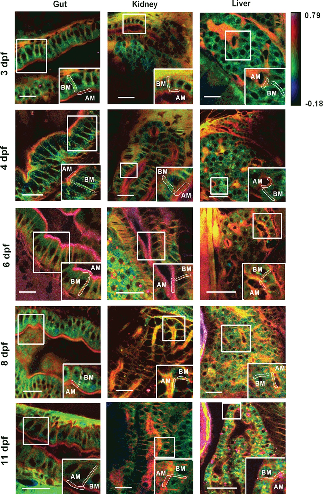 GP images of zebrafish gut, kidney and liver at different development stages. At 3–11 dpf, zebrafish larvae were stained with Laurdan, intensity images of the gut, kidney and liver recorded with a 2-photon microscope and the images converted to GP images. GP images were pseudo-colored with red indicating ordered membranes with high GP values and blue indicated fluid membranes with low GP values as per color scale. Apical (AM) and basolateral (BM) membranes were identified from the tissue morphology as shown in the zoomed regions (white squares). Scale bar = 20 µm.