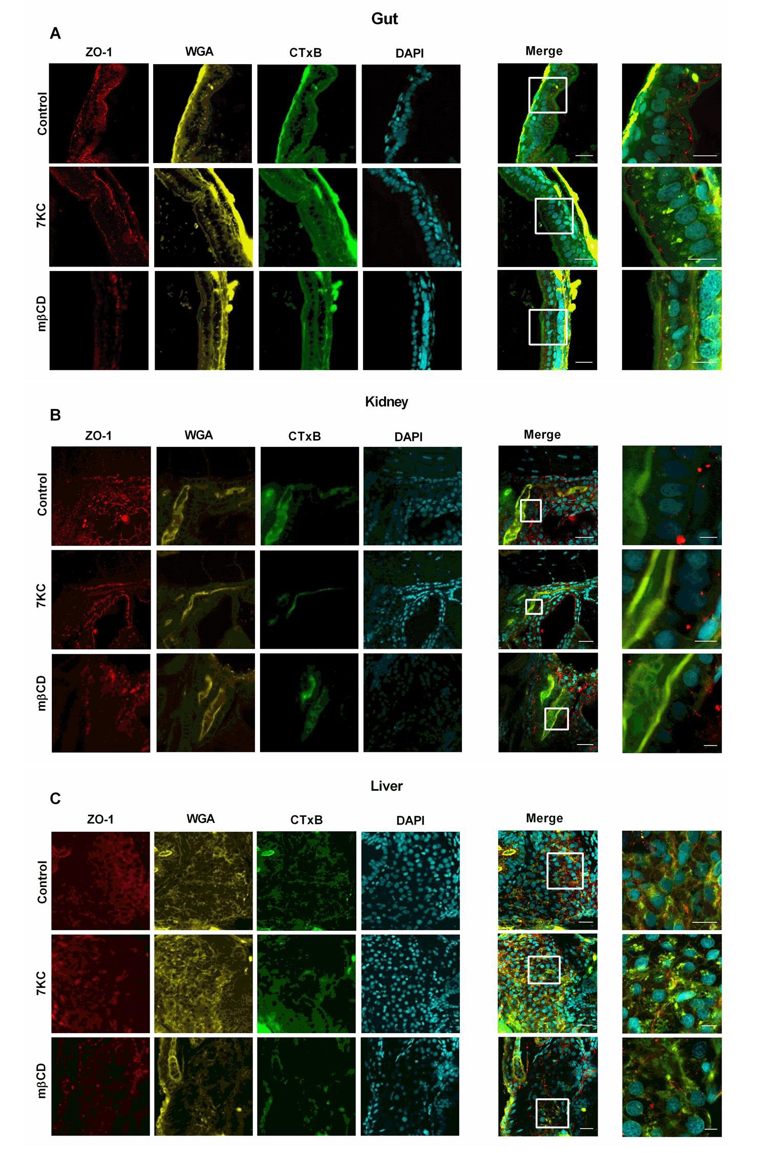 Tissue morphology of gut (A), kidney (B) and liver (C) in sterol 6 dpf zebrafish larvae. Six dpf larvae was left untreated (Control), enriched in 7-ketocholesterol (7KC, 100 µm, 30 min) or depleted of cholesterol with methyl-β-cyclodextrin (mβCD, 2.5 mm, 40 min) as in Figure 3, fixed and stained with antibodies against the tight junction marker ZO-1 (red), WGA (yellow) to mark the cell surface, CTxB (green) to label GM1-rich membranes and DAPI (blue) to visualize cell nuclei. Scale bar in merged images is 20 µm; scale bar in zoomed merged images is 5 µm.