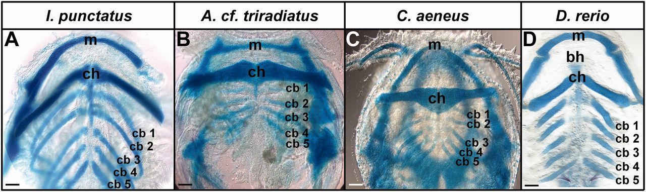 Pharyngeal arches develop later in catfish than in zebrafish. Chondrification of jaw (mandibular arch), hyoid arch, and branchial arches as detected by Alcian Blue staining. Images show lower branchial elements in ventral view. (A) Ictalurus punctatus, 96 hpf; (B) Ancistrus cf. triradiatus, 96 hpf; (C) Corydoras aeneus, 102 hpf; (D) Danio rerio, 72 hpf. m, Meckel’s cartilage; bh, basihyal; ch, ceratohyal cartilage; cb, ceratobranchial cartilages. Scale bars = 100 µm.
