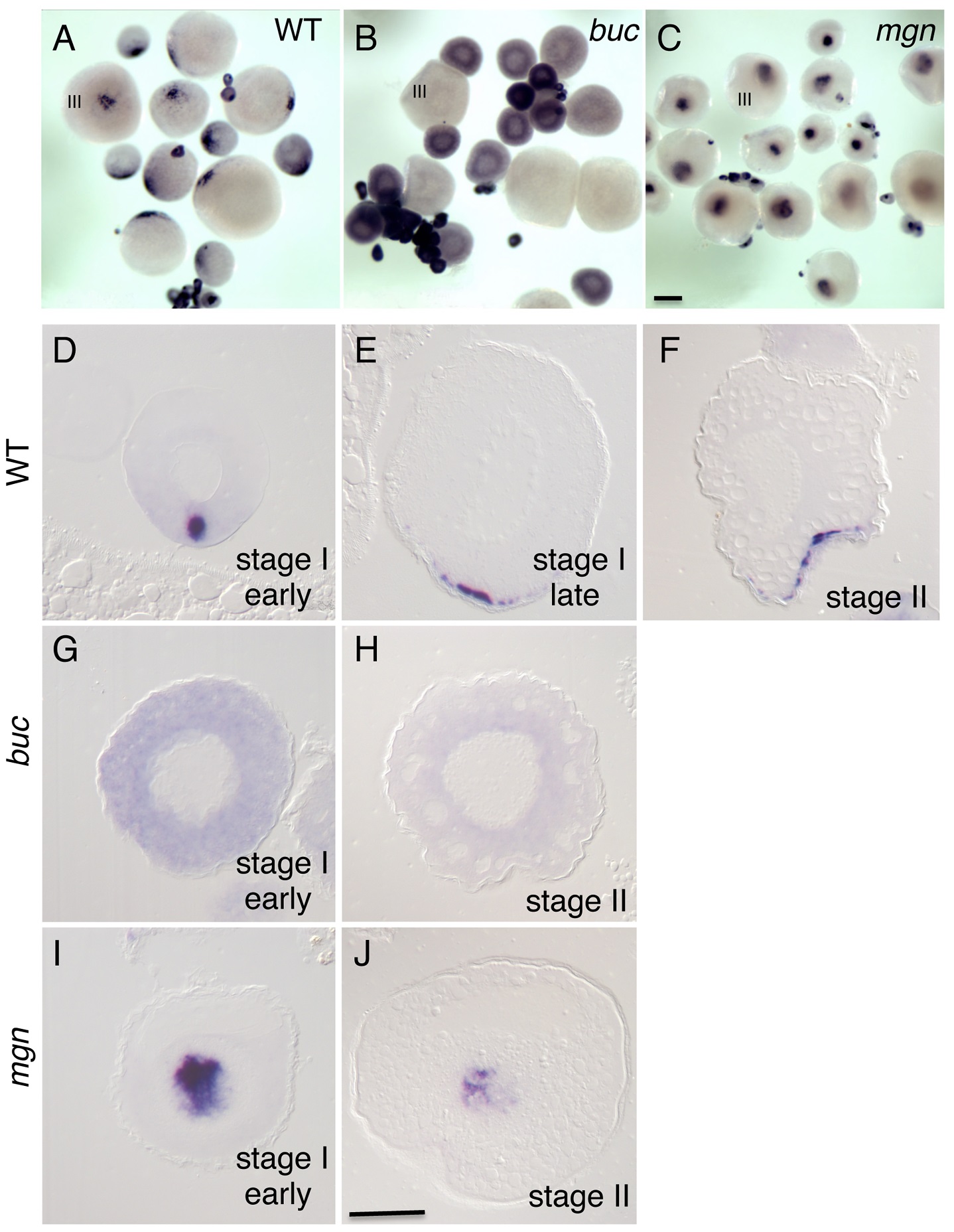 A-C) Whole mount in situ hybridization of dissected ovaries from wild-type (A), bucky ball (buc, B) and magellan (mgn, C) mutant females. In (A-C) oocytes at stage III of development are indicated. Smaller oocytes are at stages I and II, which are difficult to differentiate in whole mounts at this magnification. The grip2a mRNA localization domain is observed in an asymmetric cortical position in wild-type oocytes (A) but is unlocalized and diffuse in buc oocytes (B) and internally-located in mgn mutants (C). D-J) Sections of wild-type and mutant oocytes at the indicated stages after labeling to detect grip2a mRNA. Stages are as indicated in the panel and were determined by size and oocyte morphology according to [101]. D–F) Wild-type oocytes showing localization to the presumptive Balbiani Body (D) and subsequent localization to a cortical domain of the oocyte corresponding to the presumptive vegetal pole (E-F). G,H) buc mutant oocytes lack the Balbiani body [39], [43] and the grip2a mRNA subcellular localization domain in stage I and II oocytes. I) mgn mutant stage I oocytes exhibit an enlarged Balbiani body [40] and displayed an enlarged grip2a mRNA localization domain. J) Stage II mgn mutant oocytes fail to localize transcripts to the vegetal pole which instead persist in an internal domain [40], as observed also for grip2a mRNA. Number of oocytes examined were as follows: wild-type: early stage I: 13, stage II: 12; buc: early stage I: 35, stage II: 26; mgn: early stage I: 23, stage II: 18. Magnification bar in (C) corresponds to 250 µm for panels (A-C), and in (J) to 50 µm for panels (D–J).