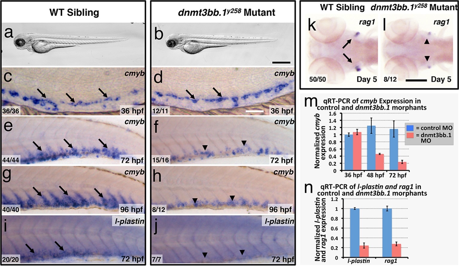 (a,b) Transmitted light images of 72 hpf control (a) and dnmt3bb.1y258 (b) mutant zebrafish, showing absence of developmental delay or gross morphological abnormalities in dnmt3bb.1y258 mutants. (c-h) Whole mount in situ hybridization of 36 hpf (c,d), 72 hpf (e,f) and 96 hpf (g,h) wild type (WT) sibling (c,e,g) or dnmt3bb.1y258 (d,f,h) mutant animals, probed for cmyb. Cmyb is expressed in dnmt3bb.1 mutant at 36 hpf (arrows) but this expression is strongly reduced by 72 and 96 hpf (arrowheads). (i-l) Whole mount in situ hybridization of 72 hpf tails probed for l-plastin (i,j) and 5 dpf heads probed for rag1 (k,l) from WT sibling (i,k) or dnmt3bb.1 (j,l) mutant animals. Expression of both l-plastin and rag1 is present in controls (arrows) but strongly reduced in dnmt3bb.1 mutant animals (arrowheads). (m) Quantitative RT-PCR analysis of cmyb transcript levels in control (blue columns) or dnmt3bb.1 (red columns) morpholino injected animals at 36, 48, and 72 hpf. Transcript levels are normalized to the reference gene elf1α and to levels in 36 hpf control morphants. (n) Quantitative RT-PCR analysis of 3 dpf l-plastin and 5 dpf rag1transcript levels in control (blue columns) or dnmt3bb.1 (red columns) morpholino-injected animals. Transcript levels are normalized to the reference gene elf1α and to levels in controls. All graphs in panels i and j show mean ± SEM, are representative of three biological replicates. Scale bars = 150 µm in a,b, 50 µm in c,d, 100 µm in e-l.