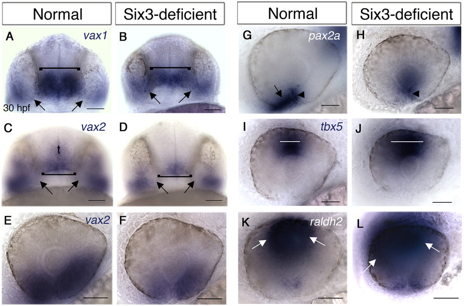 (A-L) WISH of 30 hpf normal (A,C,E,G,I,K) and Six3-deficient (B,D,F,H,J,L) embryos. (A,B) vax1 expression. Brackets marks POAs, arrows point at OSs. (C-F) vax2 expression in the POA, OS and ventral retina. Brackets marks POAs, arrows point at OSs. t, telencephalon. (G,H) pax2a expression in the optic fissure (arrowheads in G,H) and OS (arrow in G, missing in H). (I,J) tbx5 expression in dorsal retina. White lines mark the width of the region where high tbx5 levels are observed. (K,L) raldh2 expression in the dorsal retina. Arrows mark limits of high raldh2 expression. (A-D) are ventral views, anterior is up. E-L are lateral views, anterior to the left, dorsal up. Scale bars are 50 µm.