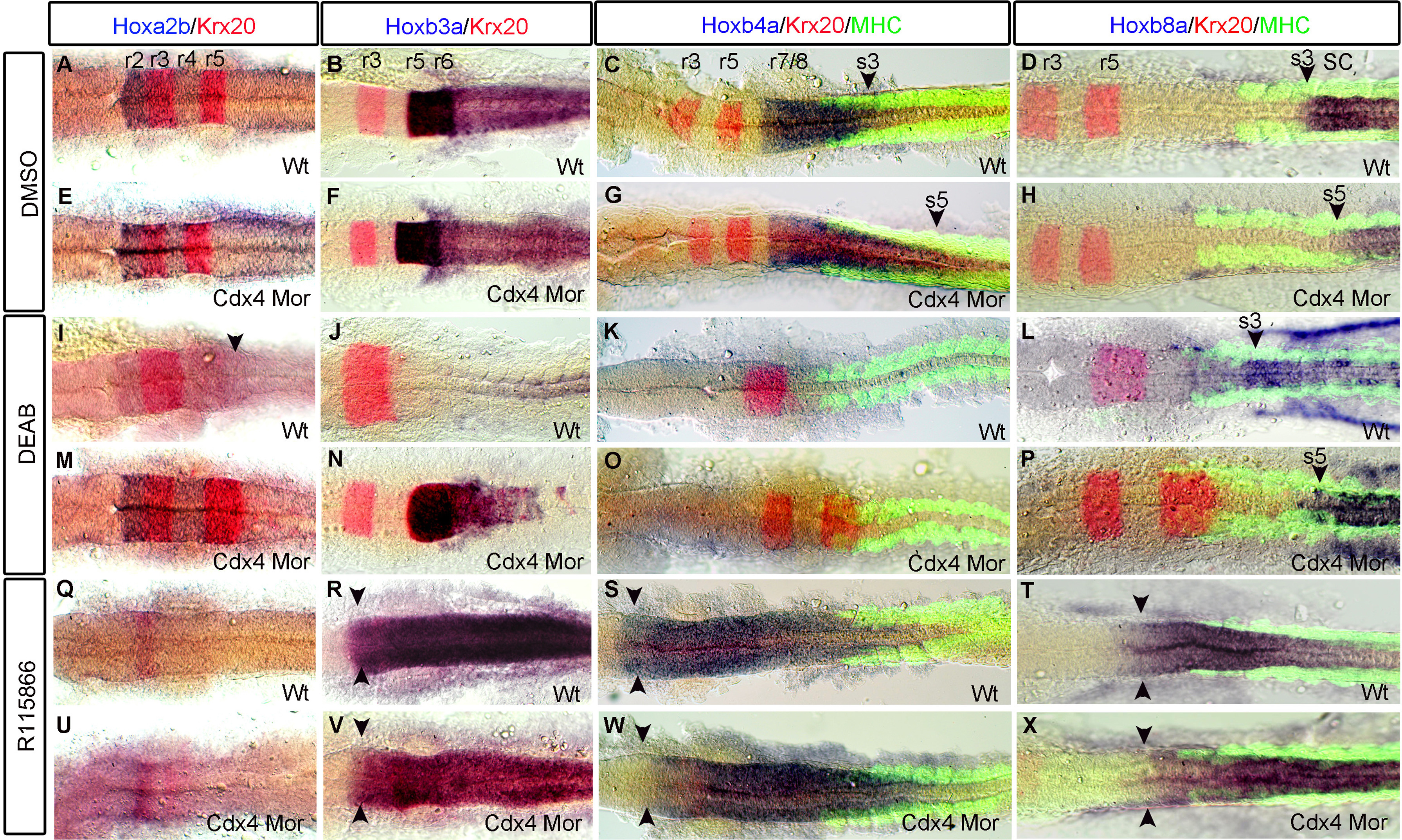 Hindbrain and spinal cord hox gene expression shifts along the AP-axis when Cdx4 or RA functions are perturbed. Expression of hoxa2b in r2-4 and hoxb3a in r5-6 is the same in Cdx4-deficient embryos (E, F) and wild-types (A, B). hoxb4a expression in r7/8 is caudally expanded in Cdx4-deficient embryos (G arrowhead) compared to wildtypes (C arrowhead). In RA-deficient embryos hoxb3a (J) and hoxb4a (K) expression is lost, while hoxa2b expression in r4 is caudally expanded (I arrowhead). In RA/Cdx4 deficient embryos, hoxb3a expression is rescued (N) but not hoxb4a (O). In both wild type and Cdx4 deficient embryos treated with R115866 hoxa2b (Q, U) expression is lost while hoxb3a (R, V) and hoxb4a (S, W) expression are both rostrally expanded. The anterior expression limit of spinal cord hoxb8a is located at somite 3 in wildtypes (D arrowhead) and RA deficient embryos (L arrowhead) but its expression is caudally shifted to somite 5 in Cdx4 deficient embryos (H arrowhead) and RA/Cdx4 deficient embryos (P arrowhead). hoxb8a expression expands into the hindbrain in both wild type (T arrowheads) and Cdx4 deficient embryos (X arrowhead) treated with R115866. (A-X) are co-stained with krx20 (r3,r5). (C, D, G, H, K, L, O, P, S, T, W, X) co-stained with myosin heavy chain antibody (somites). (A-X) flat-mounted embryos at 20 somite stage n=45/45 per condition.