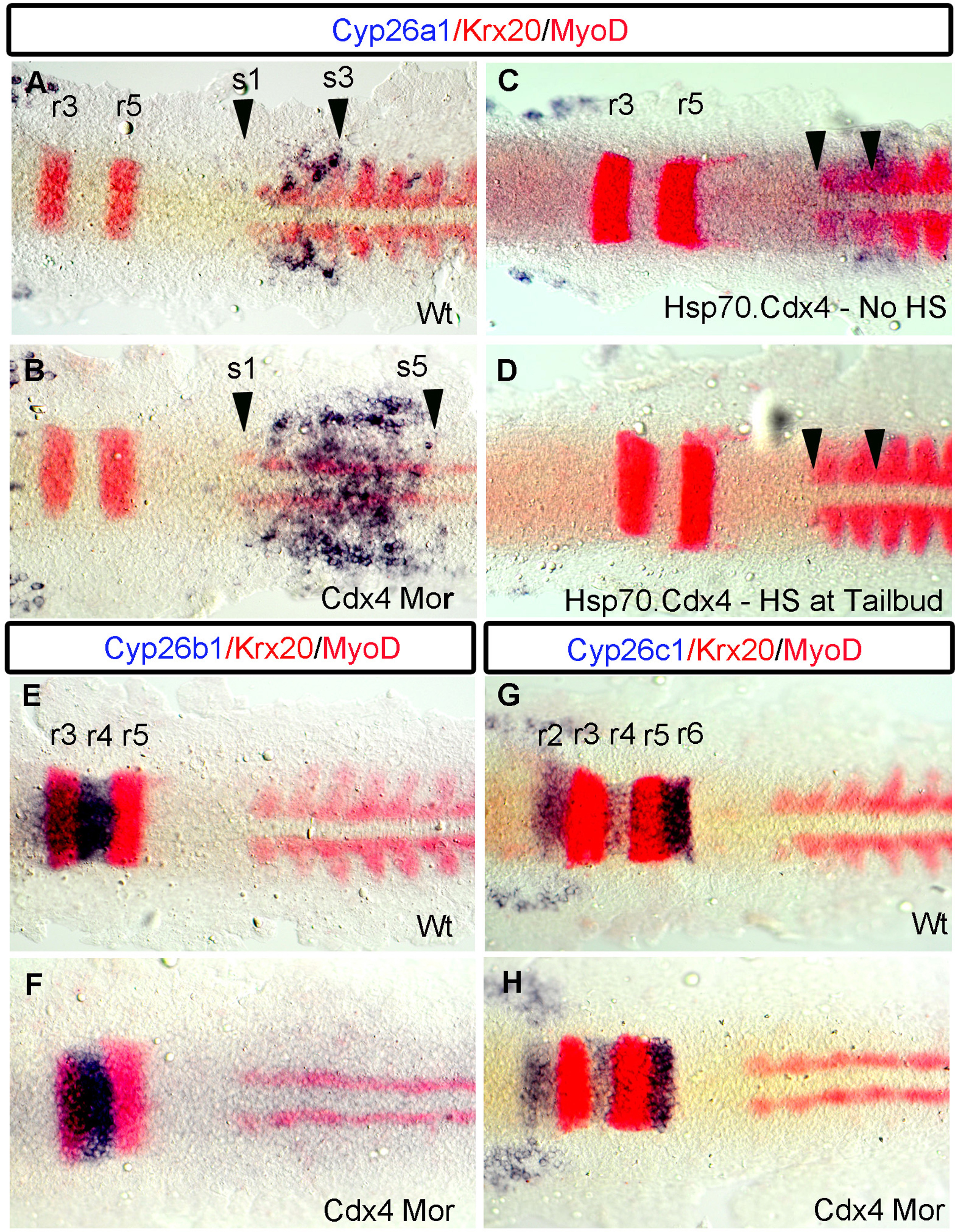 Cyp26a1 expression at the Hb-Sc transition is under the regulation of Cdx4. In wild-types, cyp26a1 is expressed in r7/8, and in the adjacent somites 1-3 (A arrowhead). In Cdx4-deficient embryos (B), cyp26a1 expression is expanded into the spinal cord domain and terminates at the level of somite 5 (B arrowhead). Overexpression of cdx4 using Tg(hsp70:cdx4) line (C) leads to abrogation of cyp26a1 expression (D arrowheads). cyp26b1 expression (E) in r3-4 and cyp26c1 expression (G) in r2,r4,r6 remain unaffected in Cdx4-deficient embryos (F, H). (A-H) Embryos are co-stained with krx20 (r3,r5), myoD (somites) and flat-mounted at the 10 somite stage. (A, B) n=30/30 (C, D) n=15/15, (E, H) n=30/30, (I, J) n=10/10 per condition.