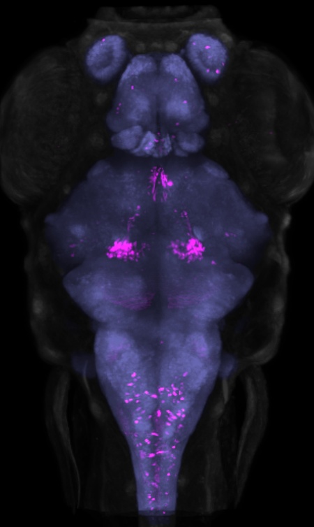 Fig.66 View of larva transgenic for y347Et and Tg(UAS:Kaede)s1999t, which expresses Kaede in hypothalamus - caudal zone (selective), medulla oblongata, floorplate and retina.