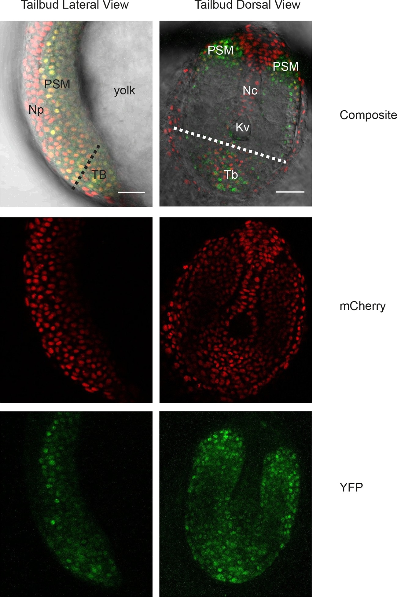 Her1-YFP-expressing cells in the zebrafish tailbud.A confocal section through the tailbud of a Her1-YFP and Histone 2A-mCherry expressing 8-somite stage Looping zebrafish embryo in both lateral and dorsal orientations. The approximate location of the segmentation clock cells removed by surgery to generate the tailbud explants and single cell cultures is shown with the dashed line. Nuclei are shown in red and YFP in green. Scale bar = 50 µm. Kupffer’s vesicle (Kv), notochord (Nc), presomitic mesoderm (PSM), tailbud (Tb), neural progenitors (Np), yolk cell (yolk).