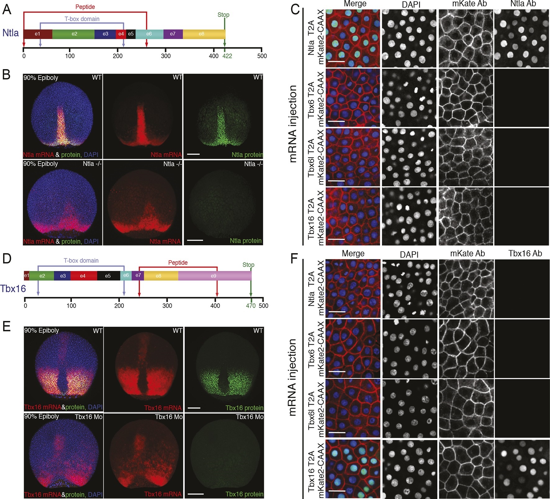 Characterization of Ntla and Tbx16 antibodies. (A, D) Graphical representation of the full-length Ntla and Tbx16 proteins with exons depicted in different colors. Blue arrows show the predicted T-box domain from amino acid 35 to 212, and 31 to 213, for Ntla and Tbx16 respectively. The Ntla antibody (clone D18-4, IgG1) was generated using a peptide from amino acid 1 to 261, while the corresponding sequence for the Tbx16 antibody (clone C24-1, IgG2a) spans the region from amino acid 232 to 405 (bracketed in red in both cases). (B, E) Representative examples showing ntla mRNA and protein expression patterns in wild type and in ntla mutant embryos at 90% epiboly. Immunolabeling using the Ntla antibody was followed by in situ hybridization using a ntla riboprobe. The same procedure was used to characterize the Tbx16 antibody except that wild type embryos are compared to tbx16 morpholino-injected embryos and a tbx16 riboprobe was used. Scale bar = 150 µm. (C, F) Immunolabeling of wild type embryos injected at 1-cell-stage with capped mRNAs (Ntla-T2A-mKate2CAAX, Tbx6-T2AmKate2CAAX, Tbx6l-T2A-mKate2CAAX or Tbx16-T2A-mKate2CAAX), fixed at 4 hr post fertilization and imaged at the animal pole where the endogenous genes are not expressed. Both Ntla (C) and Tbx16 (F) antibodies bind only in embryos injected with ntla and tbx16 mRNA respectively, demonstrating antibody specificity. Scale bar = 20 µm.