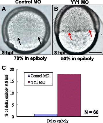 Morpholino-induced knockdown of YY1a prevents cell corpse engulfment and cell migration. a Control-MO-injected embryos, lateral view of a Control-MO-injected embryo about entering into 70 % epiboly stage at 8 hpf (indicated by arrows) reveals the normally developed. b Lateral view of a YY1-MO-injected embryo reveals the delay epiboly about 20 % (indicated by red arrows). Bars indicate 100µm. c Quantification of the delay epiboly embryos from control-MO and YY1-MO injection groups is shown the delay epiboly migration (N = 60)