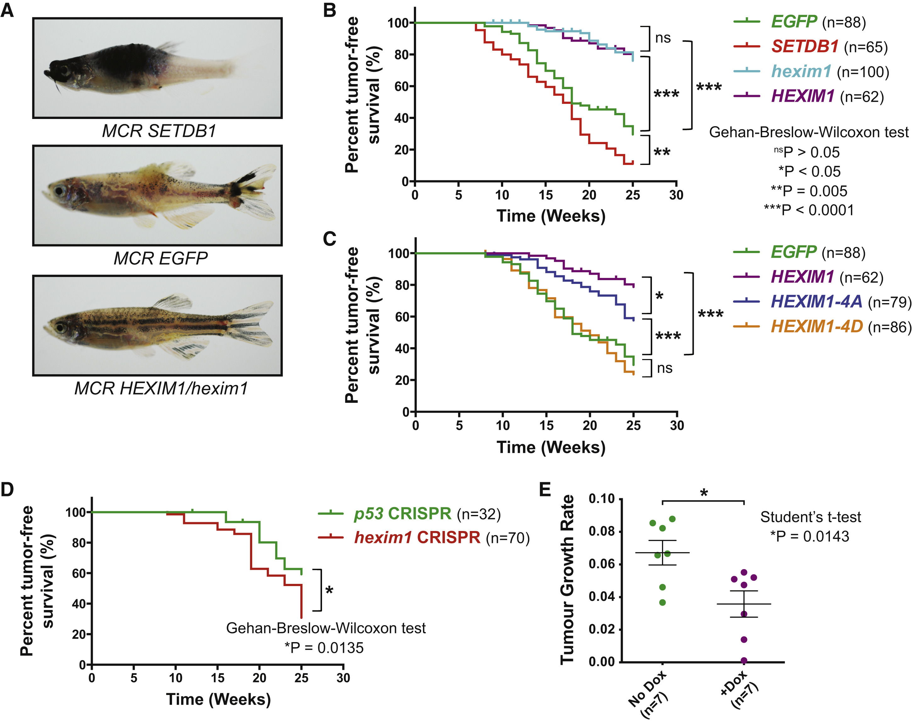 (B) Tumor-free survival curves for EGFP, SETDB1, and HEXIM1/hexim1 MiniCoopR zebrafish over 25 weeks. Percentages of the total number of zebrafish that were tumor free each week are plotted.