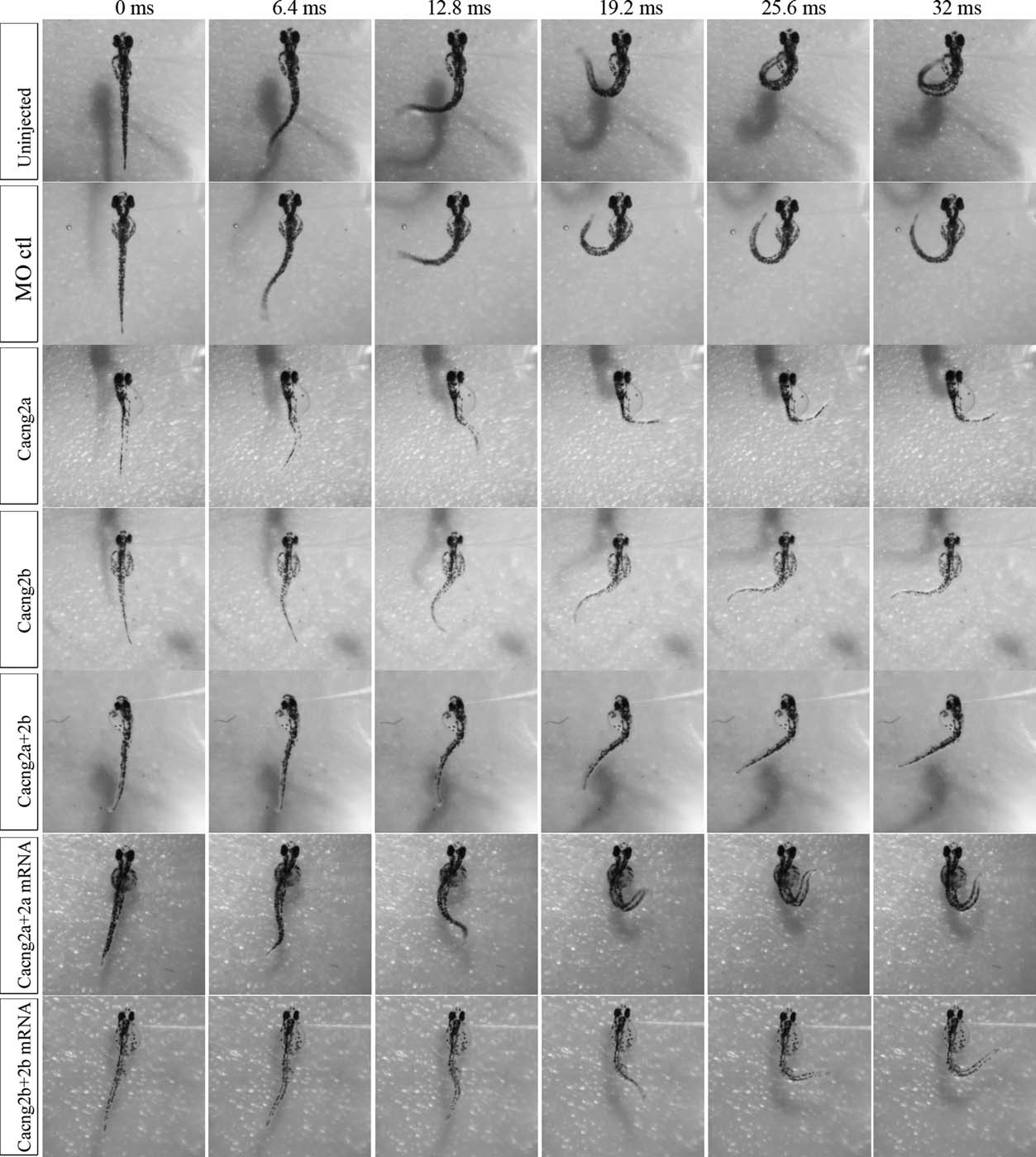 Examples of touch responses of 48–52 hpf agar-restrained embryos. Images were captured every 800 µsec but every 8th image is shown over the first 32 ms of the response. At the 32-ms time point, the uninjected and MO-injected control embryos have undergone an entire C-bend and the trunk is starting to move back. The Cacng2a and Cacng2b morphants have reached the full C-bend by 32 ms, while the Cacng2a+2b morphant has still not completed its bend. The morphants are slightly misshapen, exhibit edema and are generally smaller than the controls. Morphants injected with Cacng2a mRNA showed similar locomotor responses to controls while those injected with Cacng2b mRNA were similar to the Cacng2b morphants.