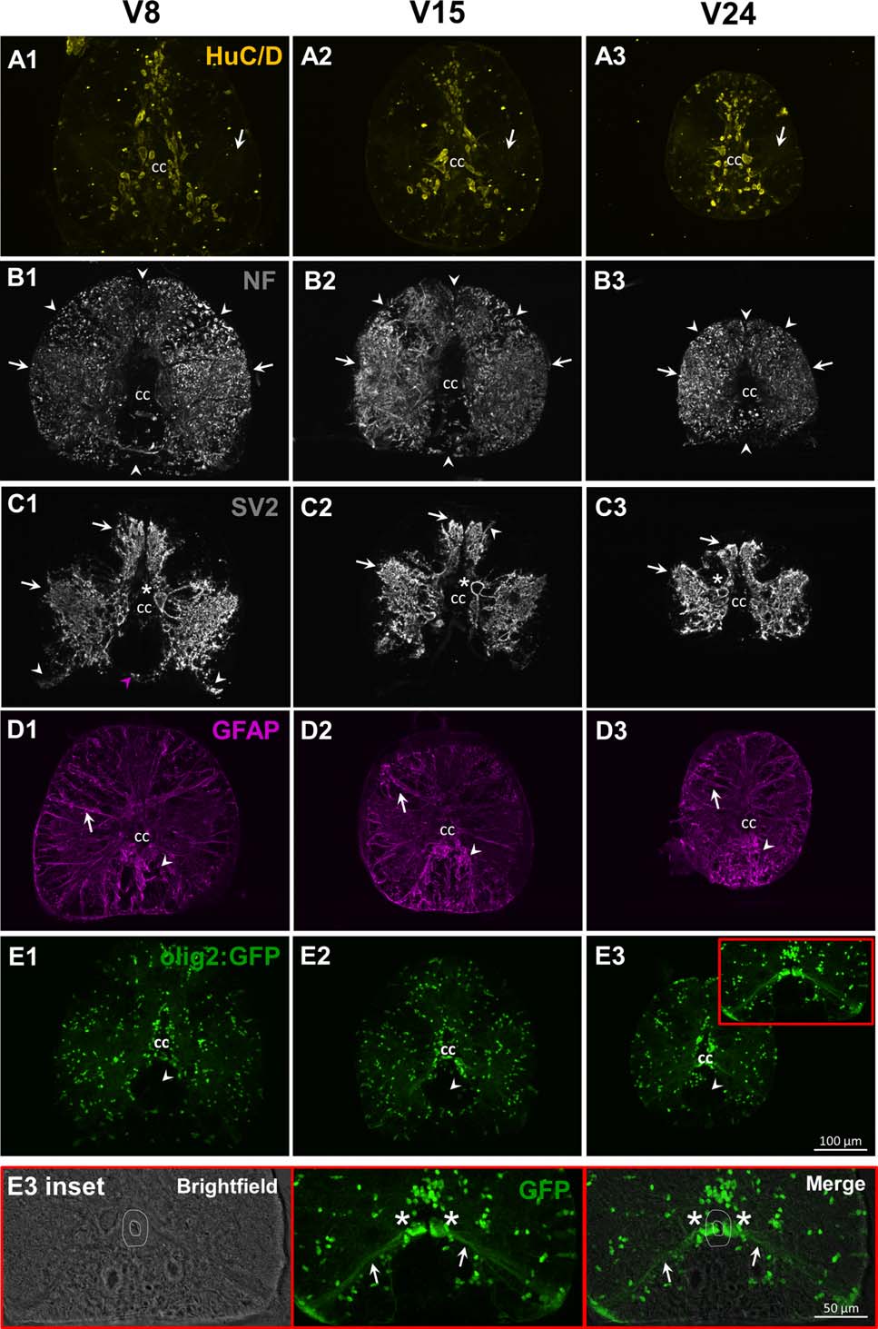 Distribution of pan-neuronal and glial markers HuC/D, NF, SV2, GFAP, and Olig2. Neurons are stained with anti-HuC/D antibody (A1-A3). The 3A10 antibody recognizes neurofilament (NF)-associated proteins and labels axonal tracts (B1-B3). The anti-SV2 (synaptic vesicle protein 2) is used to highlight synaptic terminals (C1-C3). Glial cells are identified with the zrf-1 antibody that recognizes glial fibrillary acidic protein (GFAP, D1-D3). Oligodendrocytes are visualized in olig2:GFP transgenic fish (E1-E3).