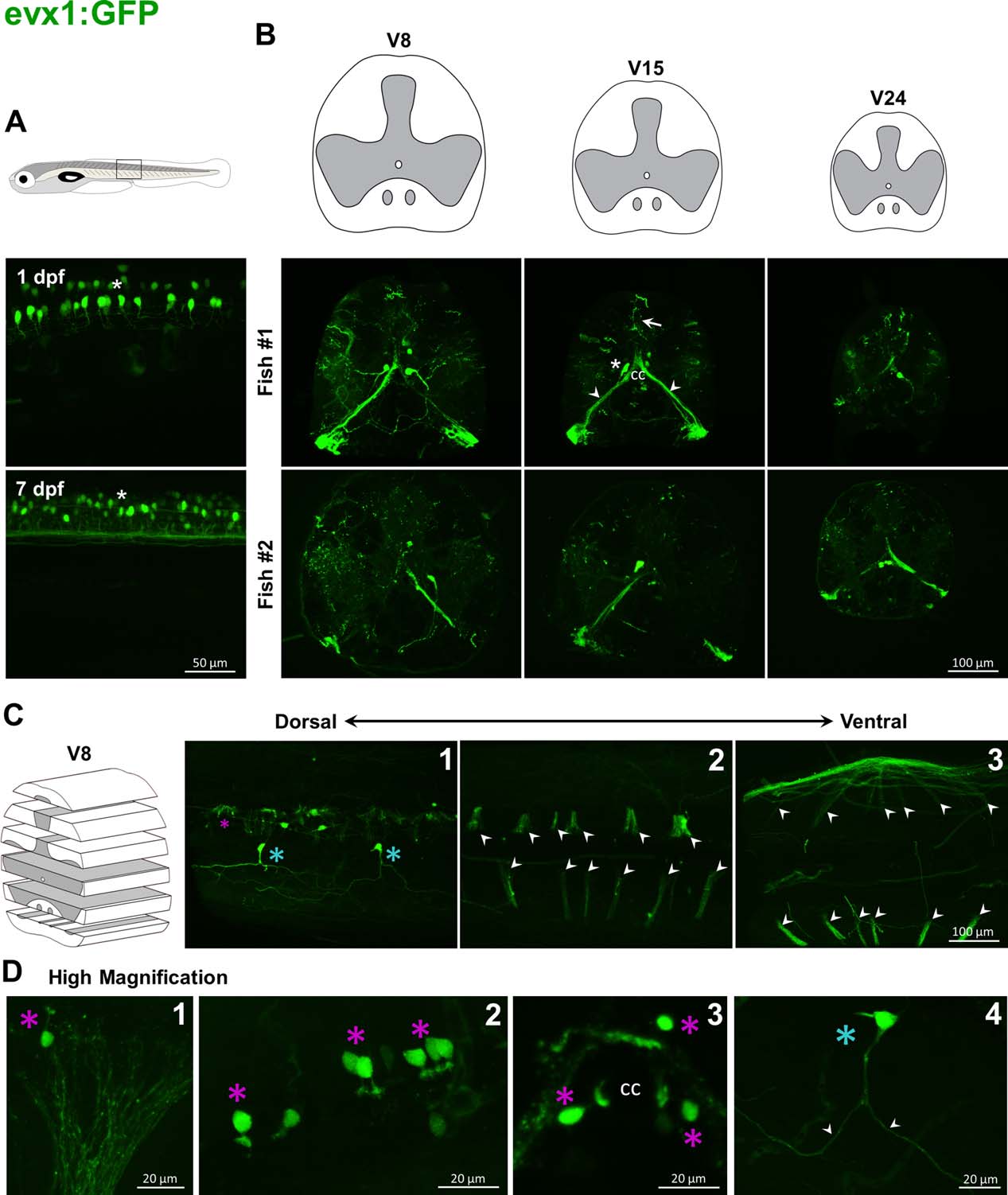 Labeling pattern of GFP in the spinal cord of adult evx1:GFP transgenic fish. In evx1:GFP embryos, GFP is driven in commissural interneurons (asterisk, A). In adults, cell bodies that project ventrally to the contralateral side along commissural paths are found adjacent to the central canal (asterisk, B). Some GFP-positive fibers sparsely covered sections (arrows, B, C). Some big bundles start above the central canal and go down to the ipsilateral ventral root (arrowheads, B, C), and their cell bodies are found around the central canal (magenta asterisks; C; D). Higher magnification shows other cells (blue asterisk, D) with processes extending to both rostral and caudal directions (arrowheads, D).