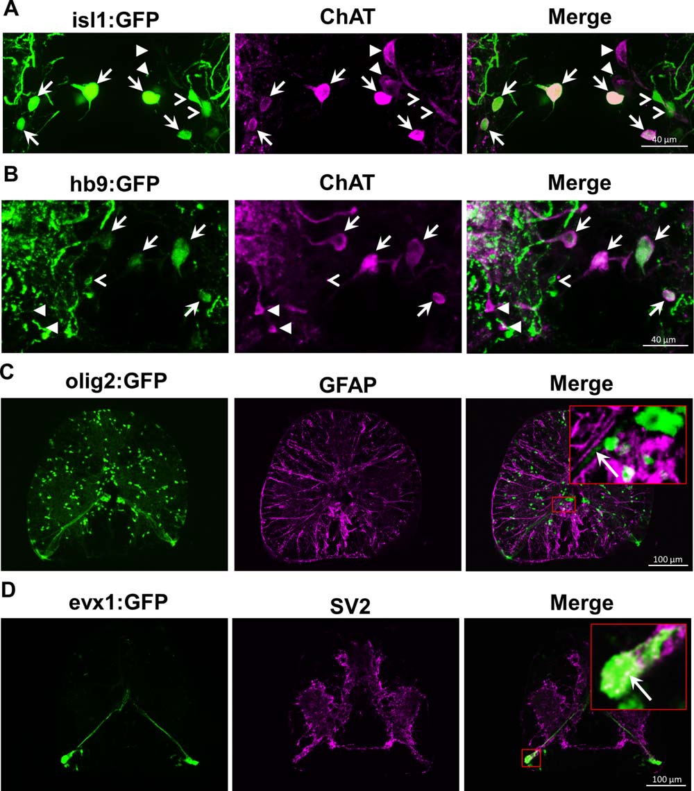 Characterization of cell identity in the spinal cord of adult GFP transgenic fish. Immunostaining with ChAT in isl1 (A) and hb9 (B) fish revealed GFP+/ChAT+ (arrows), GFP-/ChAT+ (arrowheads) and GFP+/ChAT- (open arrowheads) cells. C. The GFP-positive population in olig2:GFP fish starting close to the central canal and sending ipsilateral projection to the ventrolateral edge of the spinal cord (arrow, inset) do not express GFAP. D. The basal part of ipsilateral bundles expressing GFP in evx1:GFP fish show SV2 positive puncta (white puncta, arrow, inset).